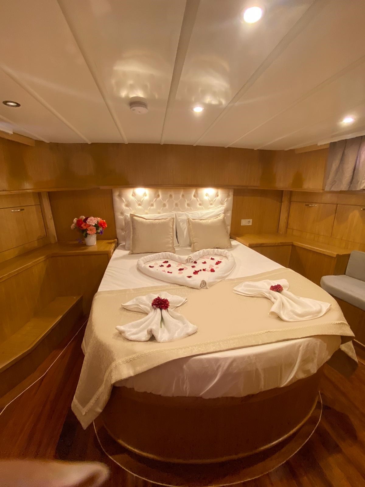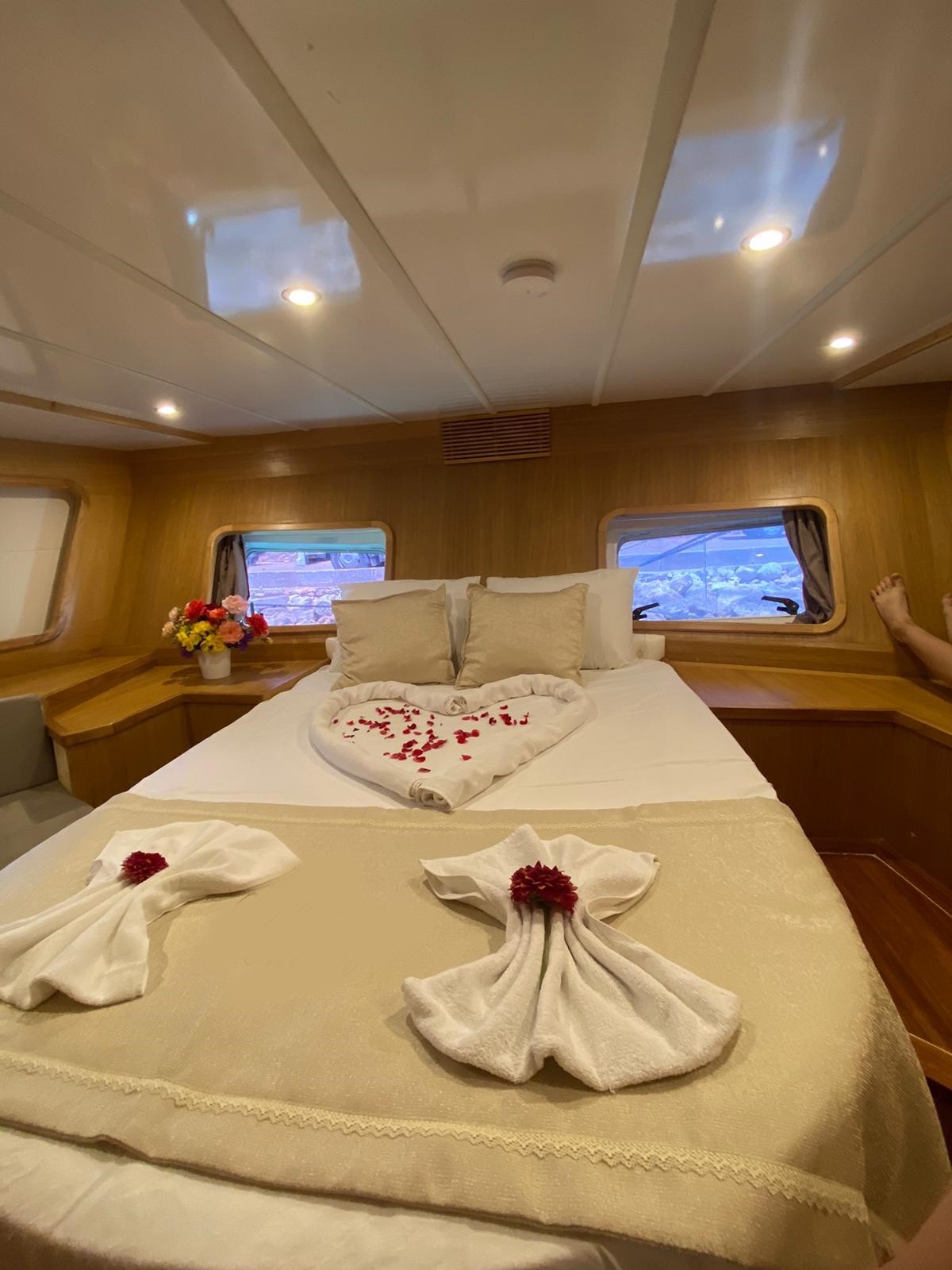 Teknemiz, 2 master ve 1 double olmak üzere toplam 3 geniş kabine sahiptir. Her kabin özel duş, tuvalet ve dolap alanı ile donatılmıştır. Ahşabın sıcak tonlarıyla bezenmiş kabinlerde, ev rahatlığında bir tatil sizi bekliyor.