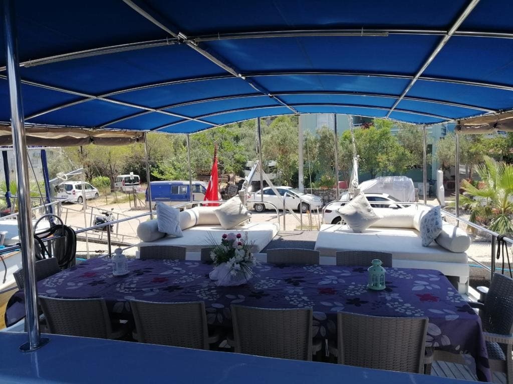 Arka güvertede yer alan yemek masası ve oturma alanı, ön güvertede ise güneşlenme minderleri ile donatılmış rahat bir yaşam alanı bulunmaktadır. Güneşin tadını çıkarabileceğiniz, yemeklerinizi keyifle yiyebileceğiniz alanlar mavi yolculuğunuzu özel kılar.