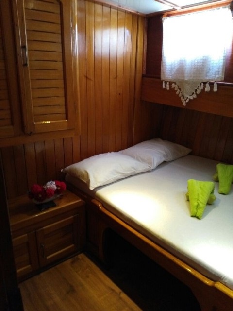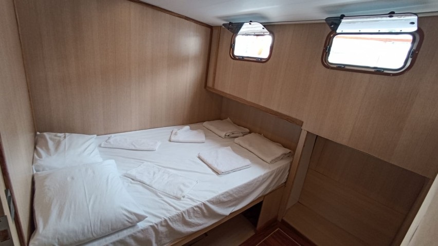Klimasız ekonomik kategoride yer alan teknemiz, 4 double ve 1 master kabin olmak üzere toplam 5 kabiniyle 10 kişilik misafir kapasitesine sahiptir. Her kabinde banyo ve wc mevcut olup, geniş iç hacmi sayesinde hem aileler hem de arkadaş grupları için idealdir.