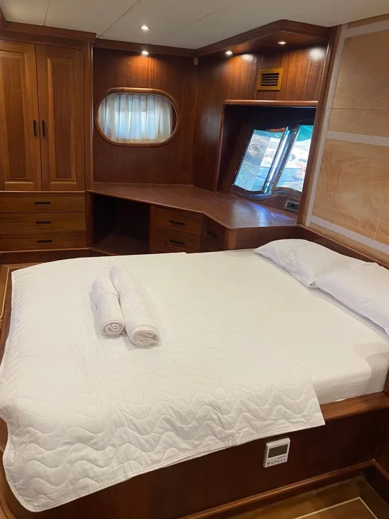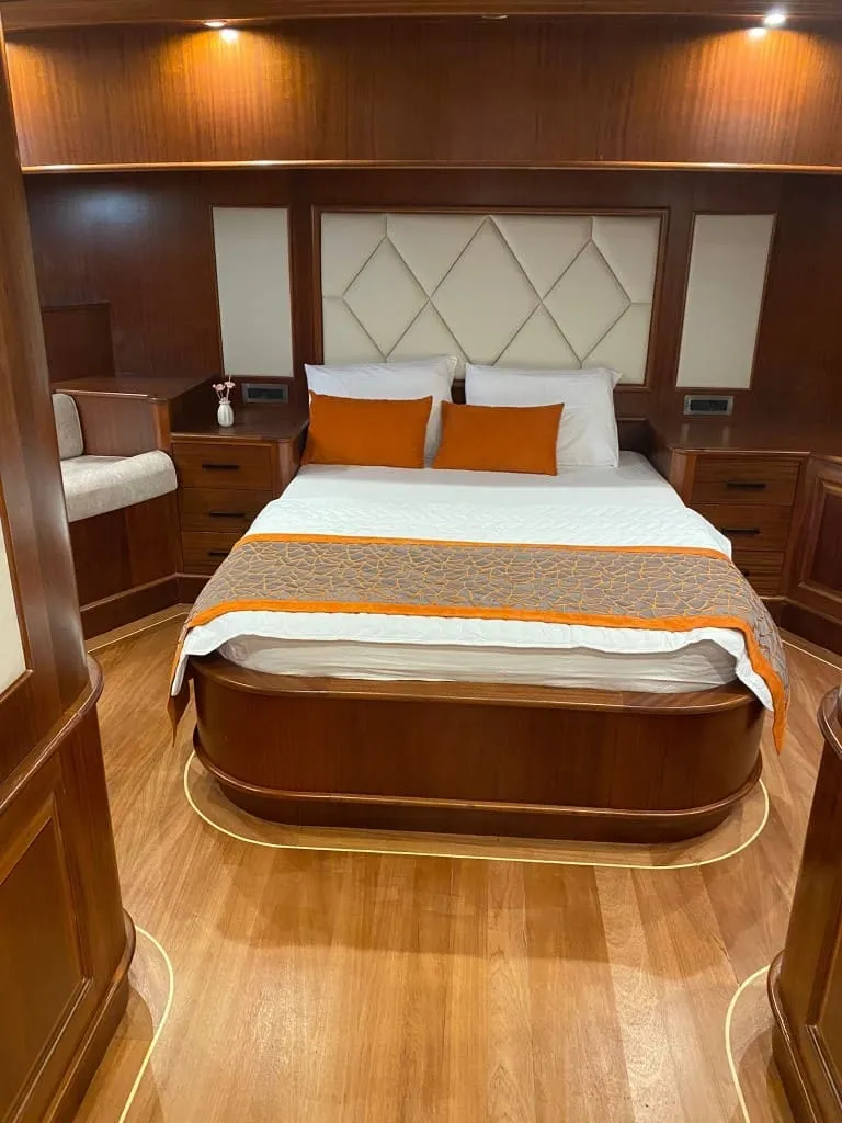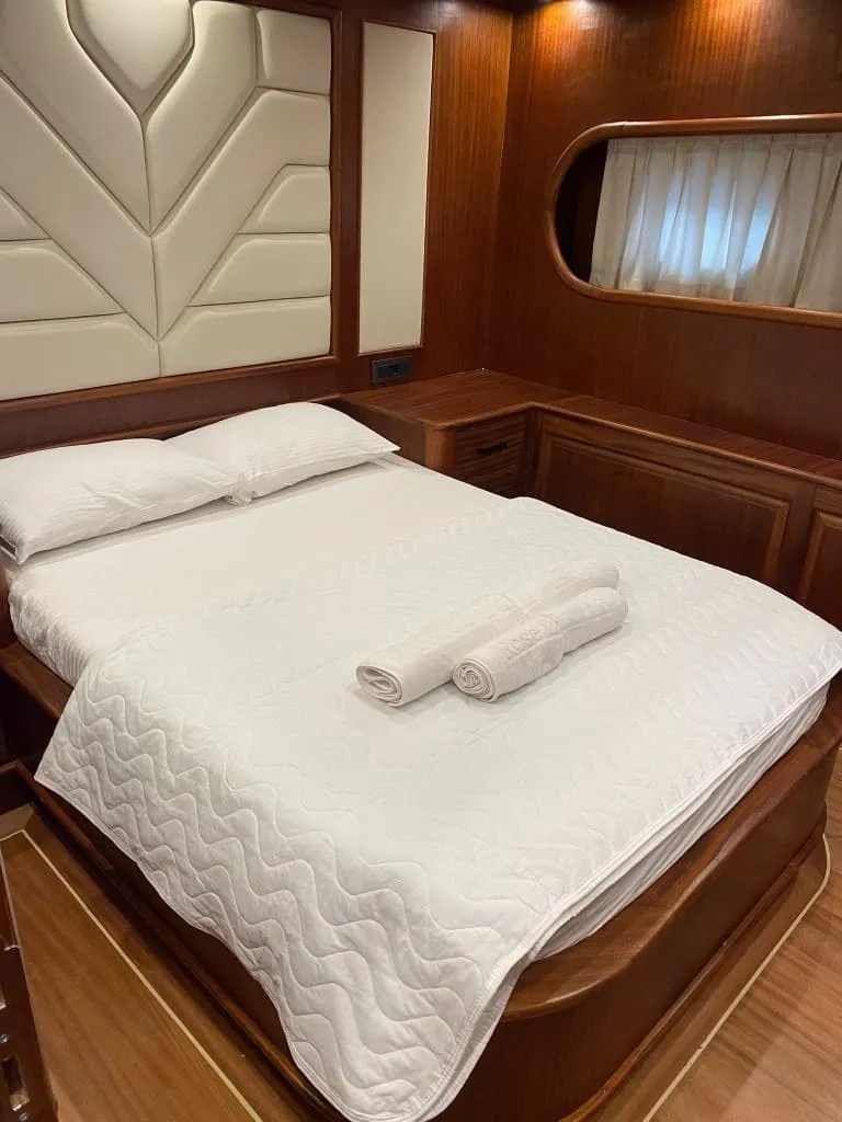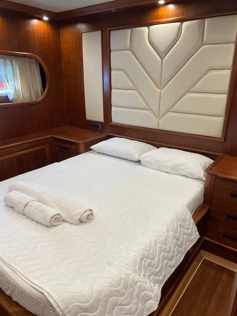 Rose Del Mar’da tamamı özenle tasarlanmış 5 kabin bulunmakta olup, 2 master, 2 double ve 1 twin kabin dağılımı ile toplamda 10 kişiye kadar olan misafir gruplarını ağırlayabilmektedir. Tüm kabinlerde yer alan konforlu yataklar, özel banyolar ve klima sistemi sayesinde gece ve gündüz 8-12 saat aralığında ideal iç ortam sıcaklığını sunar. Yelkenleriyle de seyir keyfi sunan teknemiz, 8 knot seyir ve 10 knot maksimum hız kapasitesiyle hem güvenli hem de akıcı bir yolculuk vadediyor.