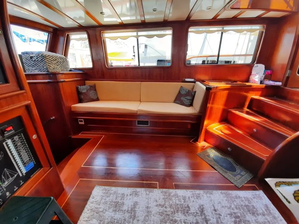 Arka güvertede konforlu bir yemek alanı ve oturma grubu, ön güvertede ise geniş güneşlenme minderleri sayesinde misafirlerimize denizle iç içe bir tatil deneyimi sunulmaktadır.