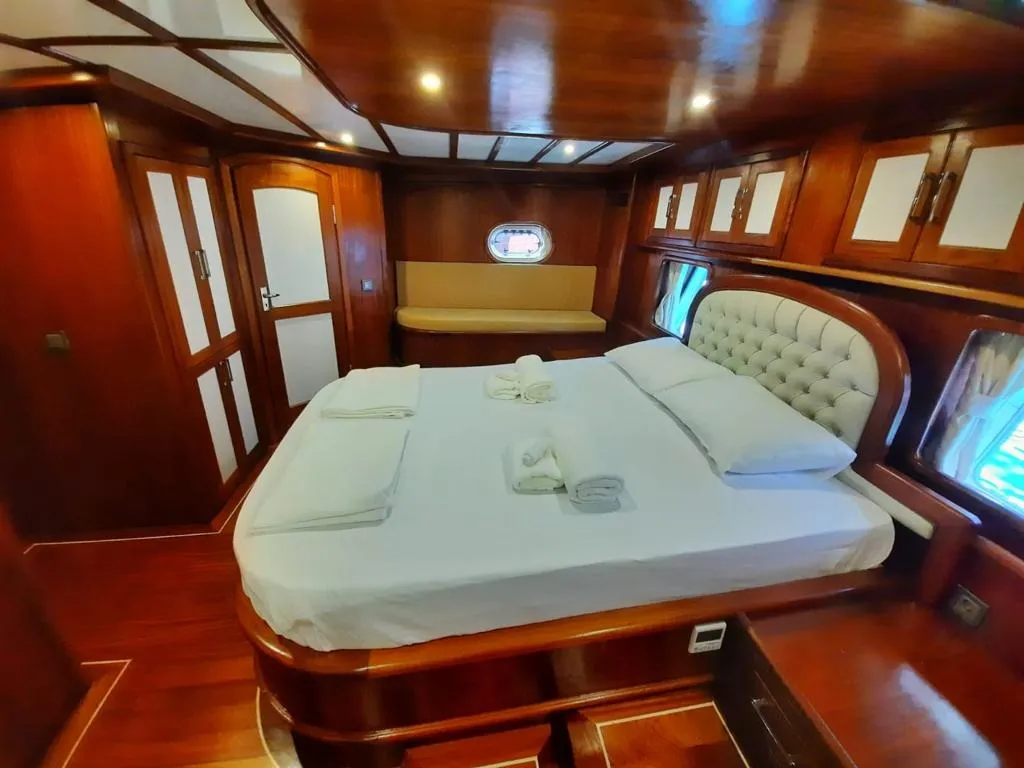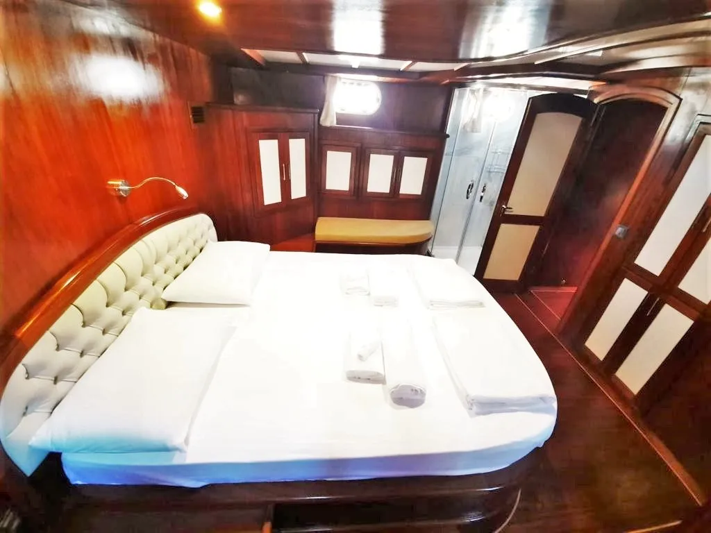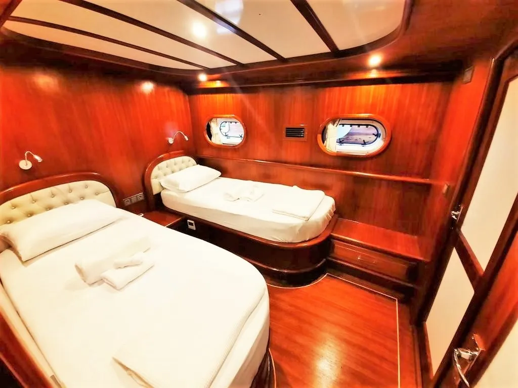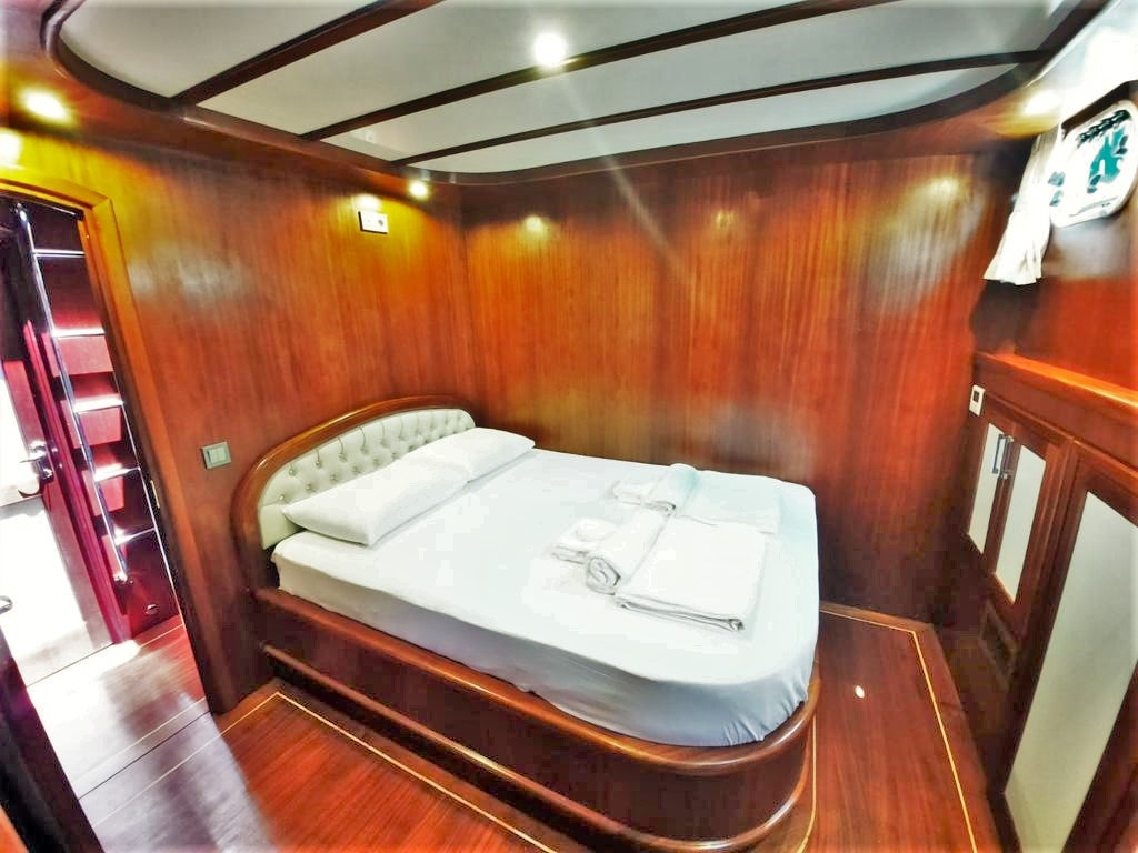 Teknemizde 2 master, 2 double ve 1 twin olmak üzere toplam 5 ferah kabin bulunmaktadır. Her kabinde ebeveyn banyosu ve klima mevcut olup, klima kullanımı gün içinde 4-6 saat ile sınırlıdır.
