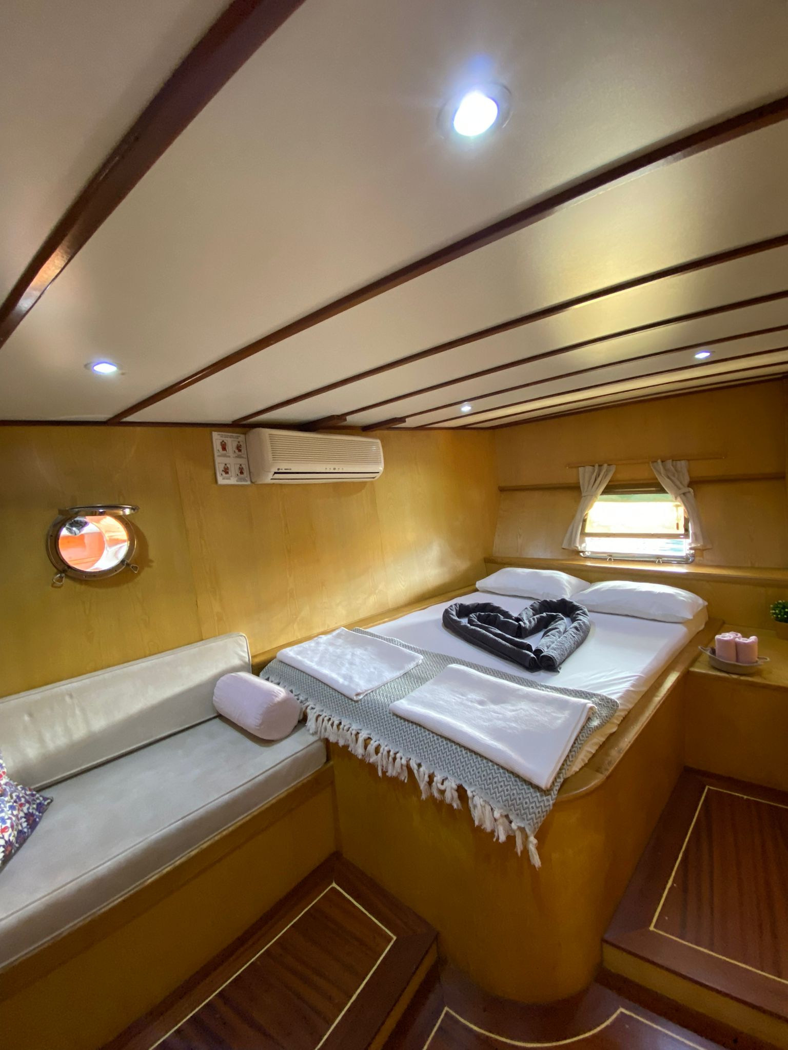 4 double kabini ile 8 kişiye kadar olan gruplarınıza konaklama imkânı sunan yatımızda her kabinde duş ve tuvalet bulunmaktadır.