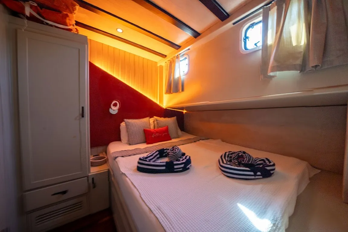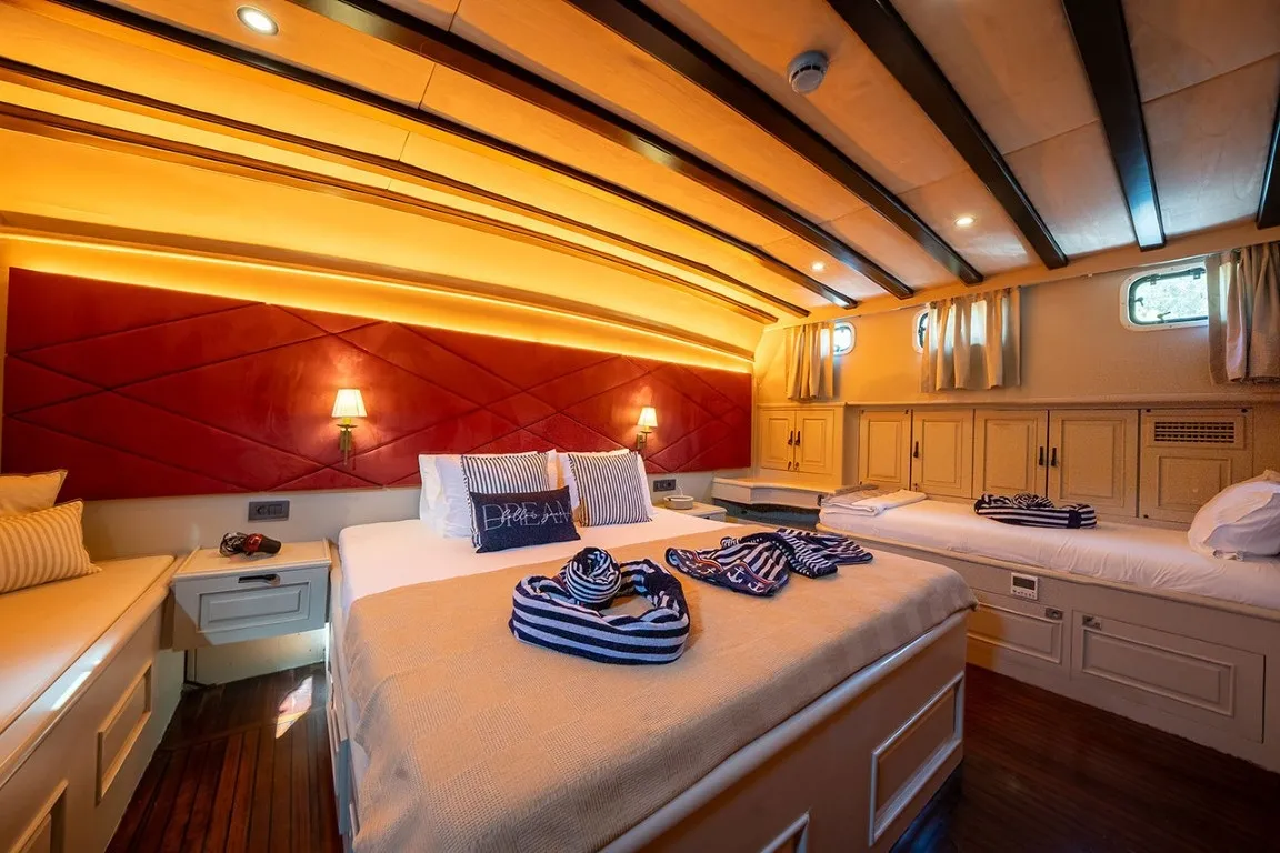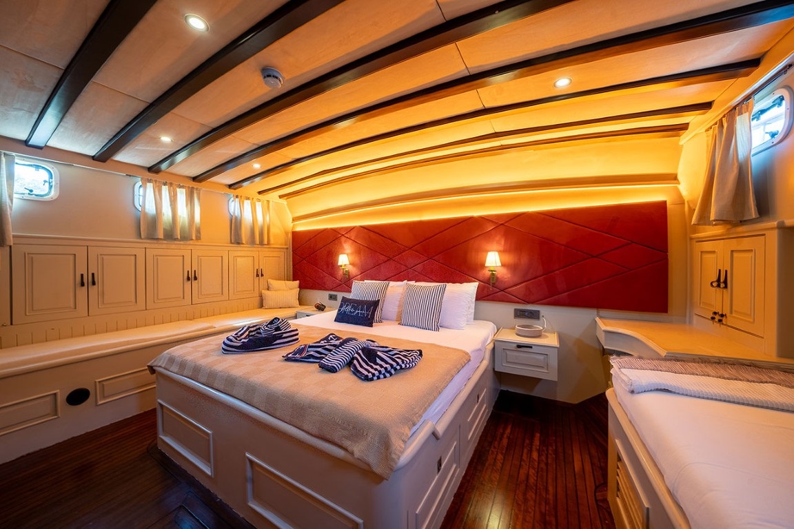 Ketch tipi guletin en güzel örneklerinden biri olan Ariella, hem estetik duruşu hem de fonksiyonelliğiyle dikkat çeker. Misafirlerimizin rahatlığı ön planda tutularak tasarlanan teknemiz, 2 master ve 3 double kabin olmak üzere toplamda 10 kişilik kapasiteye sahiptir. Her kabinde özel duşakabinli banyo, ev tipi tuvalet, saç kurutma makinesi ve gün içinde 8 - 12 saat hizmet veren çalışan klima sistemi mevcuttur.