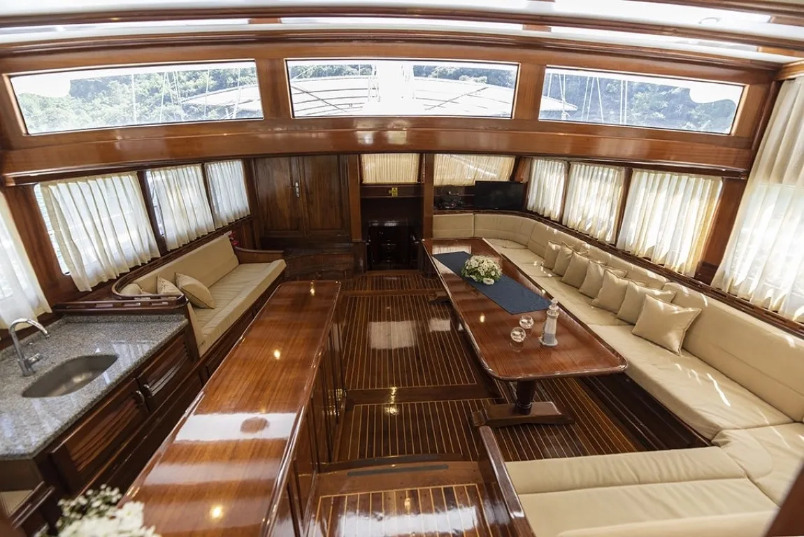 Salon bölümünde ayrı bir yemek masası bulunmakta olup, tüm yemekler tam donanımlı mutfakta özenle hazırlanır. Tüm kabinlerde ve salonda tv, dvd ve müzik sistemi gibi donanımlar sayesinde yolculuğunuz boyunca hem dinlenir hem de eğlenirsiniz.