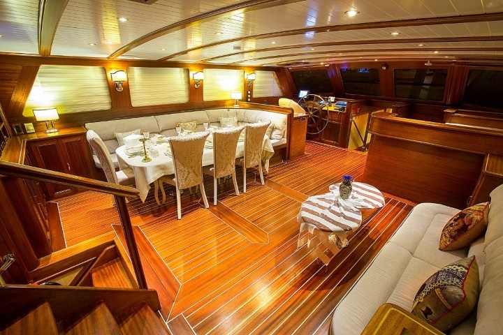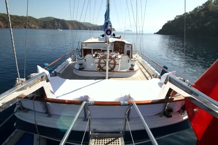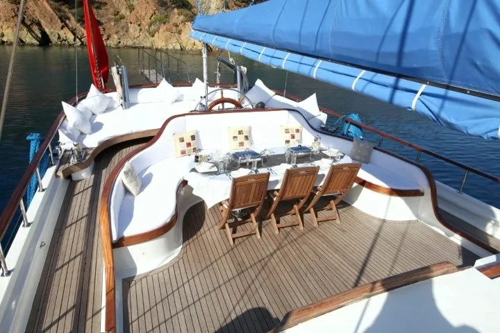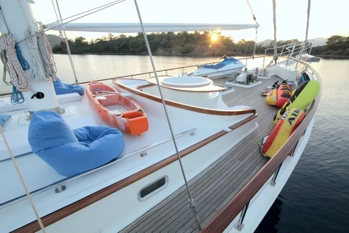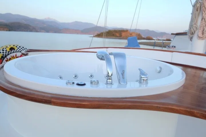 Geniş güverte alanları, rahat oturma grupları ve şık dekorasyonuyla teknemiz, denizde geçen günlerinizi unutulmaz kılmak için tasarlanmıştır. Ön güvertede yer alan jakuzi, gün batımına karşı huzurlu anlar sunarken, arka güvertedeki yemek ve dinlenme alanı, arkadaşlarınız ve ailenizle keyifli vakit geçirmenizi sağlar.