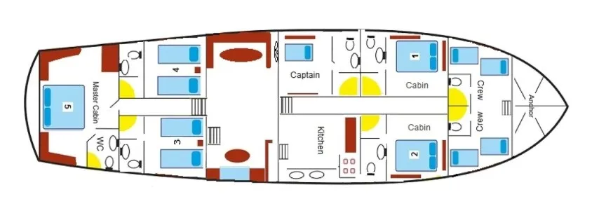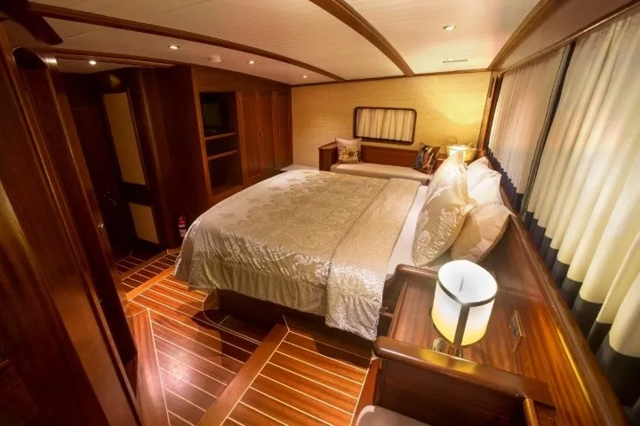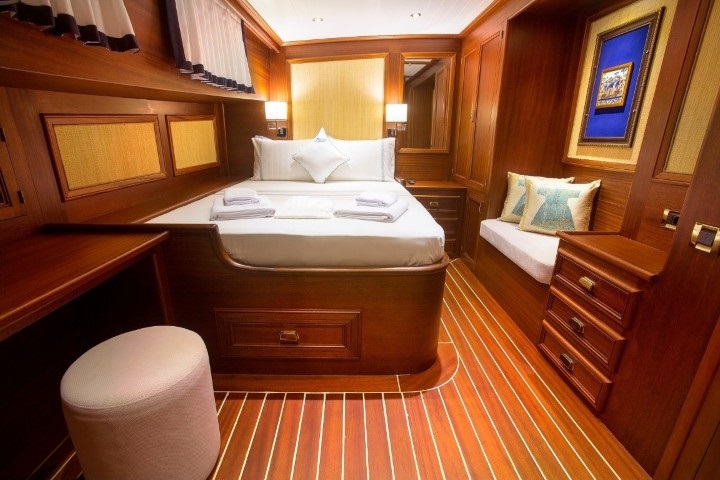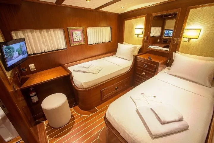 Teknemiz, 1 master, 2 double ve 2 twin kabini ile 10 kişiye kadar olan grupları ağırlayabilecek kapasitededir. Tüm kabinlerde klima, banyo ve televizyon yer almakta, 24 saat kesintisiz klima hizmeti sayesinde her mevsim konforlu bir tatil sunulmaktadır.