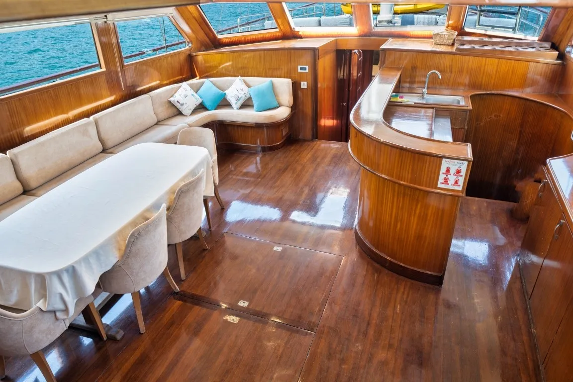 Ayrıca teknemizin salonunda lcd tv, dvd oynatıcı ve müzik seti gibi imkanlar misafirlerimizin keyifli vakit geçirmesi için düşünülmüştür. 1 kaptan, 2 gemici ve 1 aşçıdan oluşan deneyimli mürettebatımız, sizlere kusursuz ve keyif dolu bir tatil sunmak için hizmetinizde olacaktır.