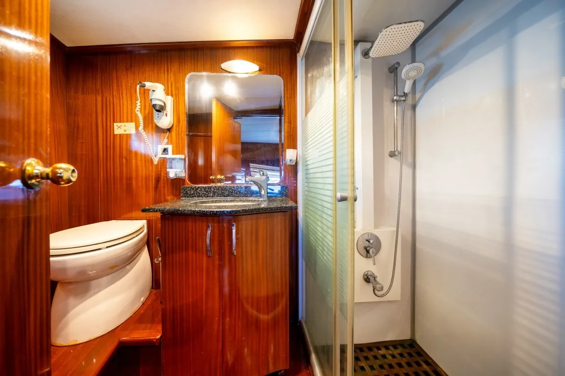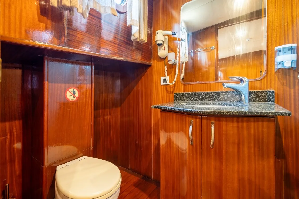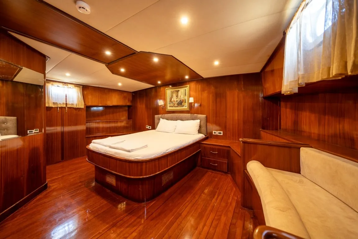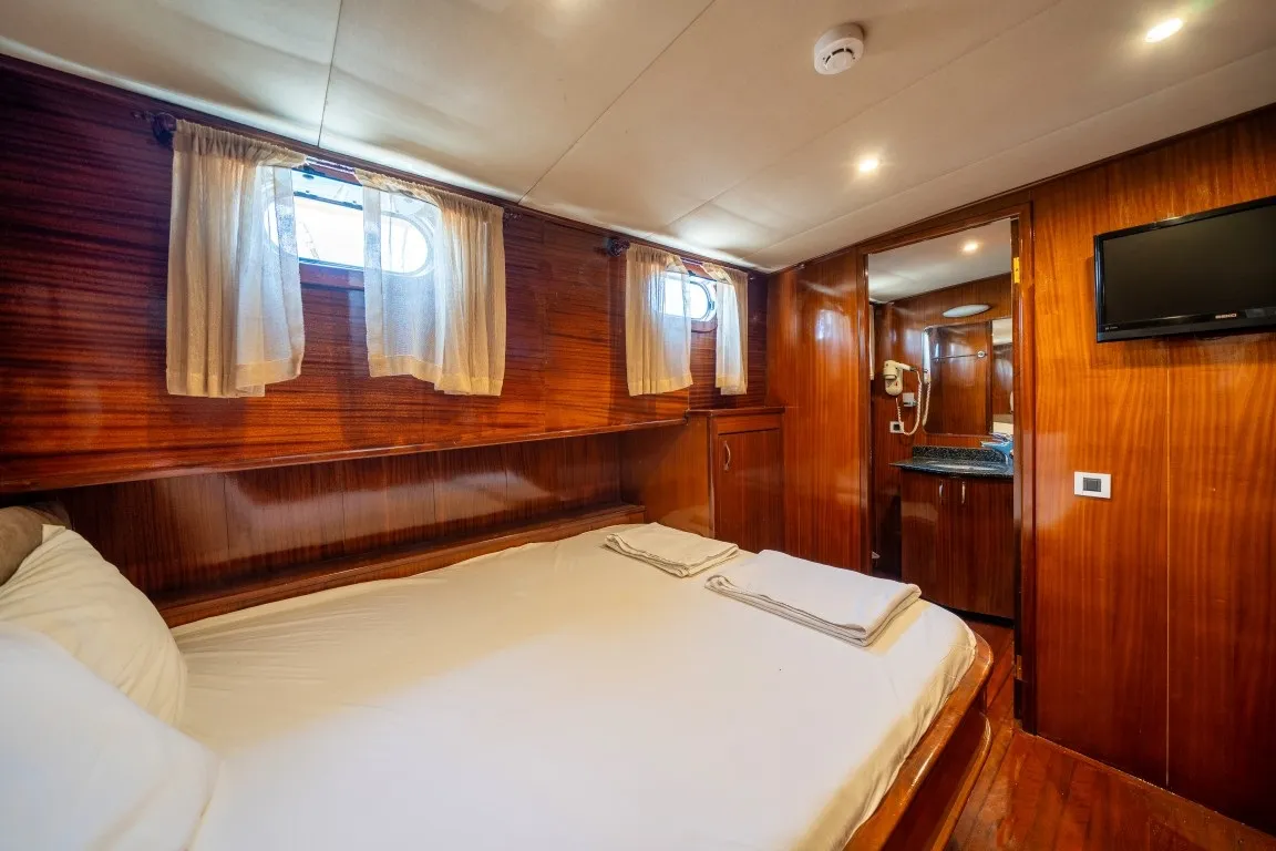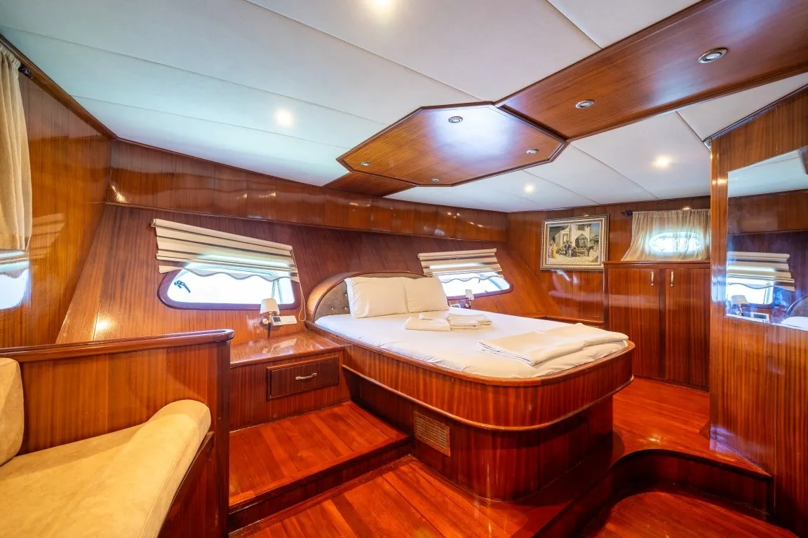 30 metre uzunluğa ve 8 metre genişliğe sahip olan yelkenli guletimiz, delüks plus kategorisinde yer almakta olup 12 kişilik konaklama kapasitesi sunmaktadır. 2 master, 2 double ve 2 twin kabinli yapısıyla geniş ve konforlu bir alan sağlayan teknemizin tüm kabinlerinde özel wc, duşakabin ve klima bulunmaktadır. Sıcak yaz günlerinde konforunuz için kabinlerde ve salonda 8 - 12 saat klima hizmeti sunulmaktadır.