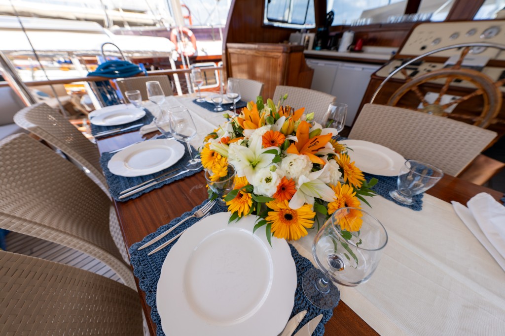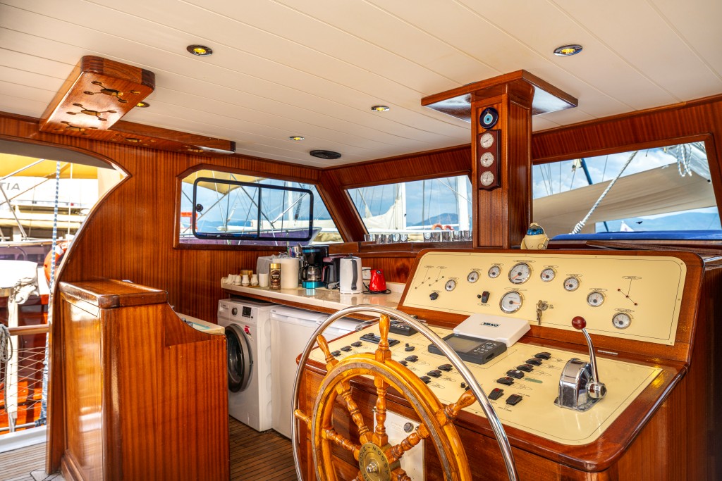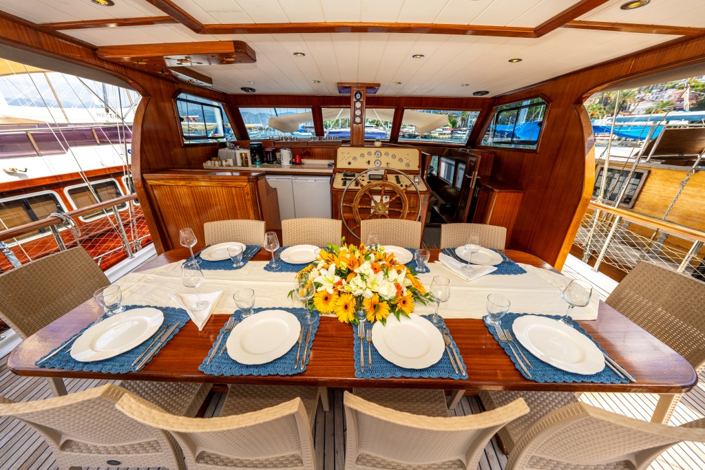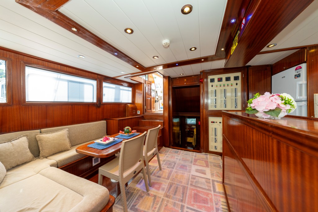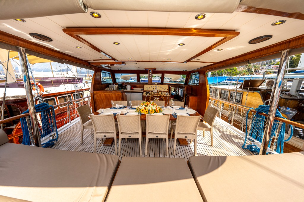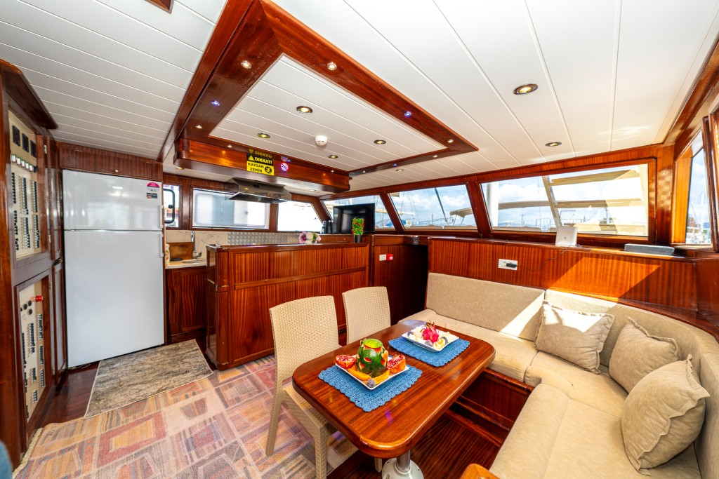 Kasapoğlu 6’nın geniş arka güvertesinde yemek masası ve rahat oturma alanı bulunurken, ön güvertede oturma alanı, iki küçük masa ve güneşlenme minderleriyle misafirlerin keyifli vakit geçirmesi sağlanmaktadır. Tam donanımlı mutfakta fırın, buzdolabı, derin dondurucu, buz makinesi, kahve makinesi yer alır.