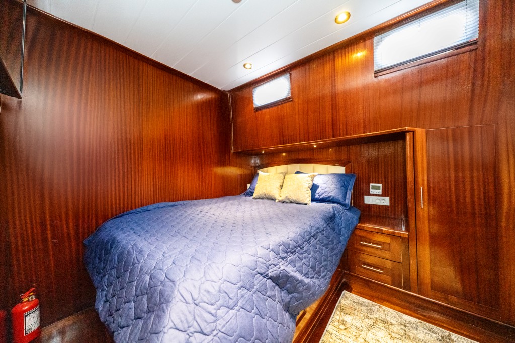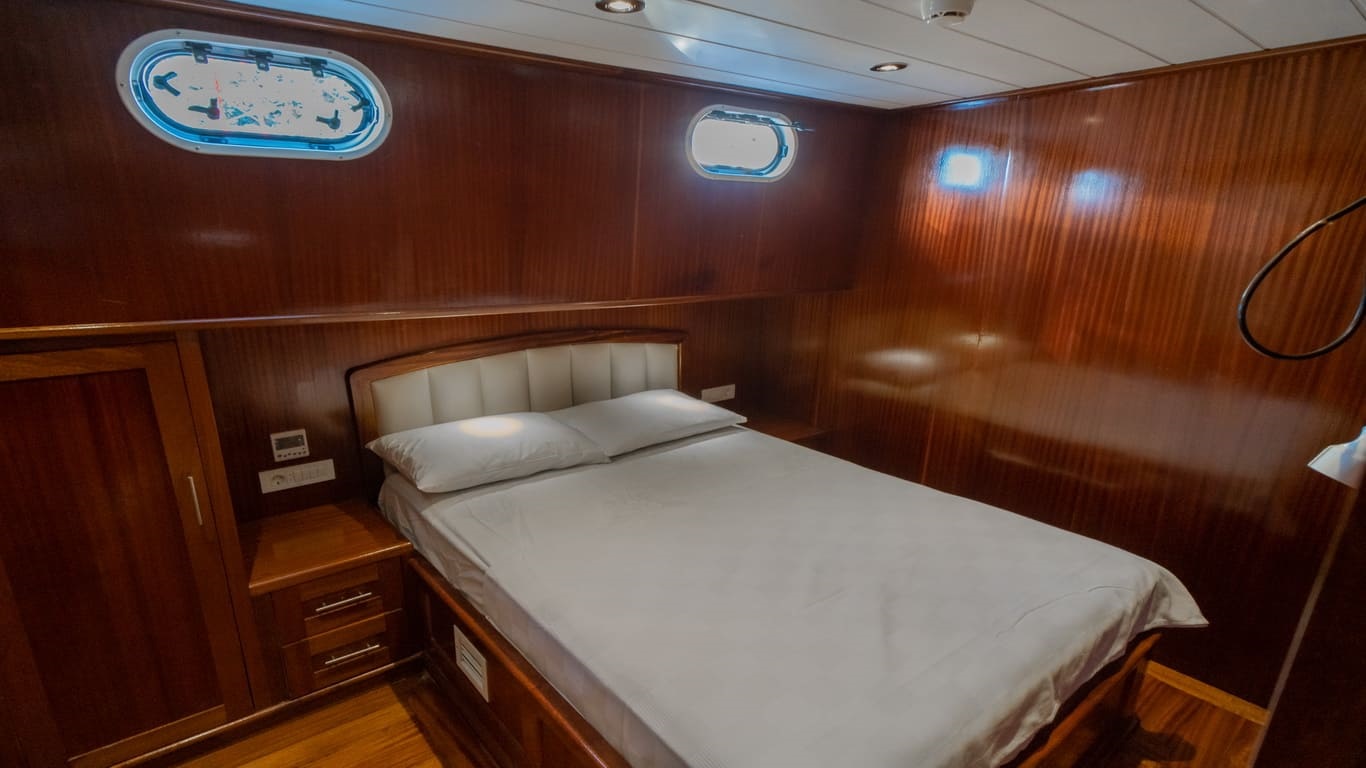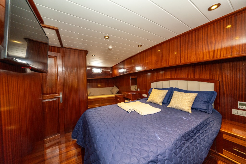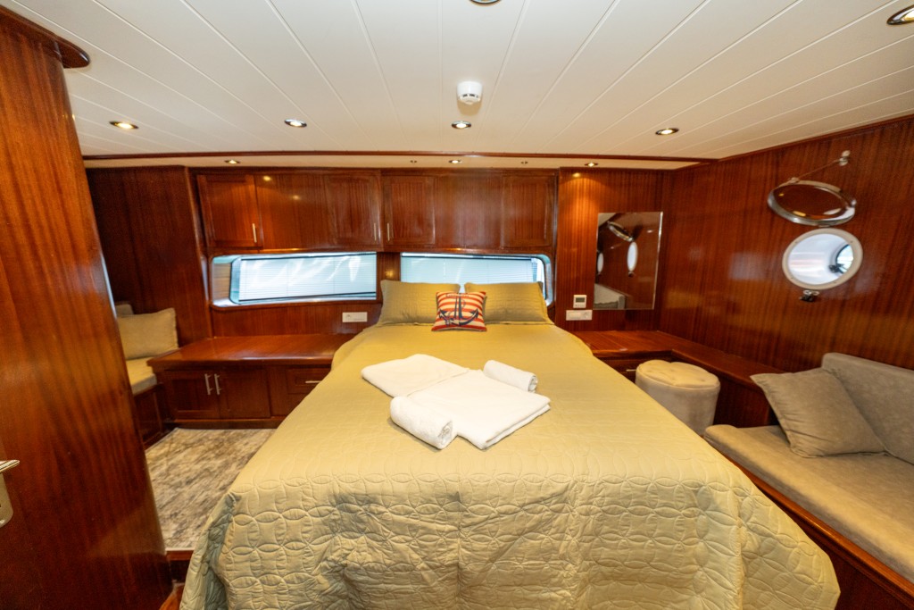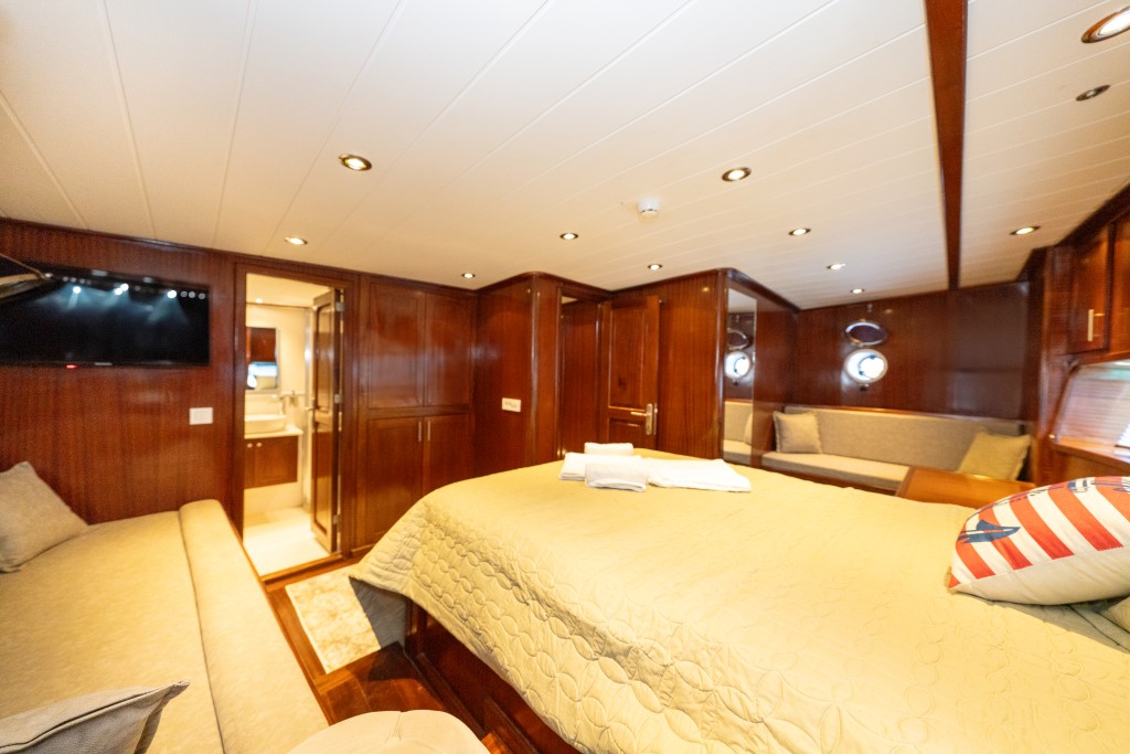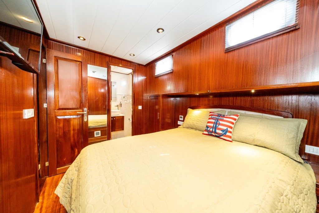 2022 yapımı, 21 metre uzunluğa ve 6,5 metre genişliğe sahip lüks guletimiz Kasapoğlu 6, Fethiye tekne kiralama kategorisinde misafirlerimize sunulan en konforlu seçeneklerden biridir. 2 master ve 2 double kabiniyle toplam 10 kişilik yasal kapasiteye sahip olan teknemiz, her kabinde ev tipi wc, şık duşakabin, klima ve saç kurutma makinesi ile donatılmıştır.