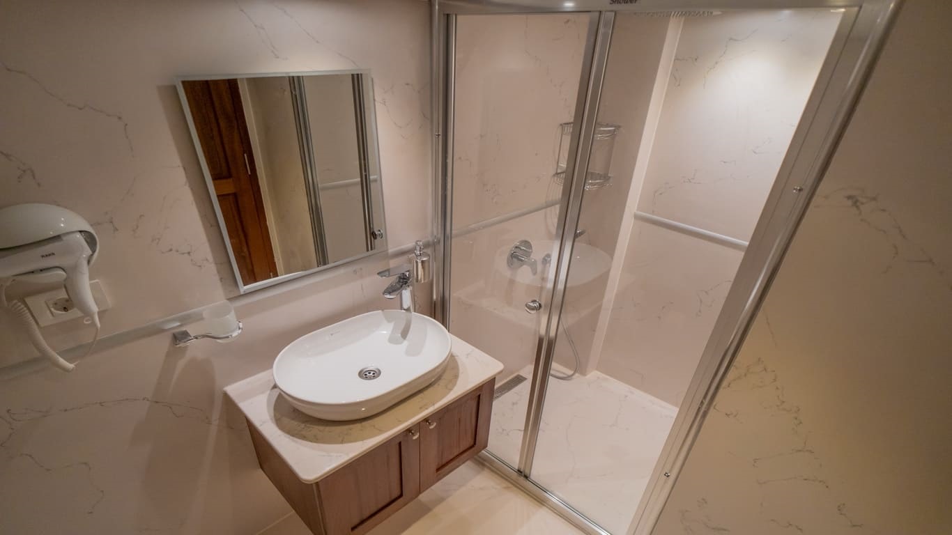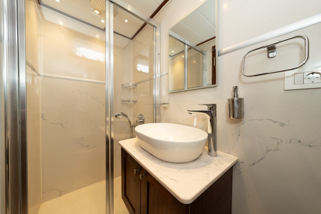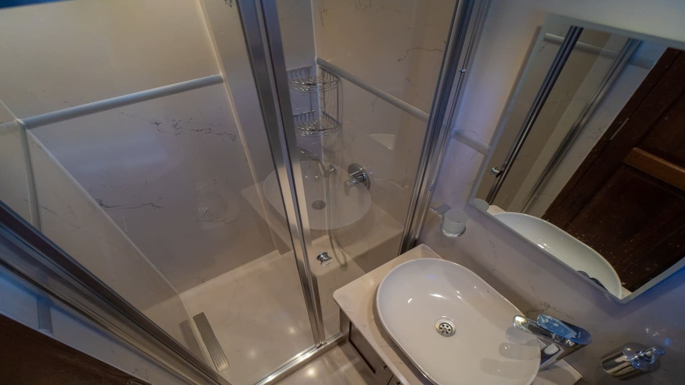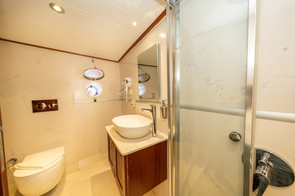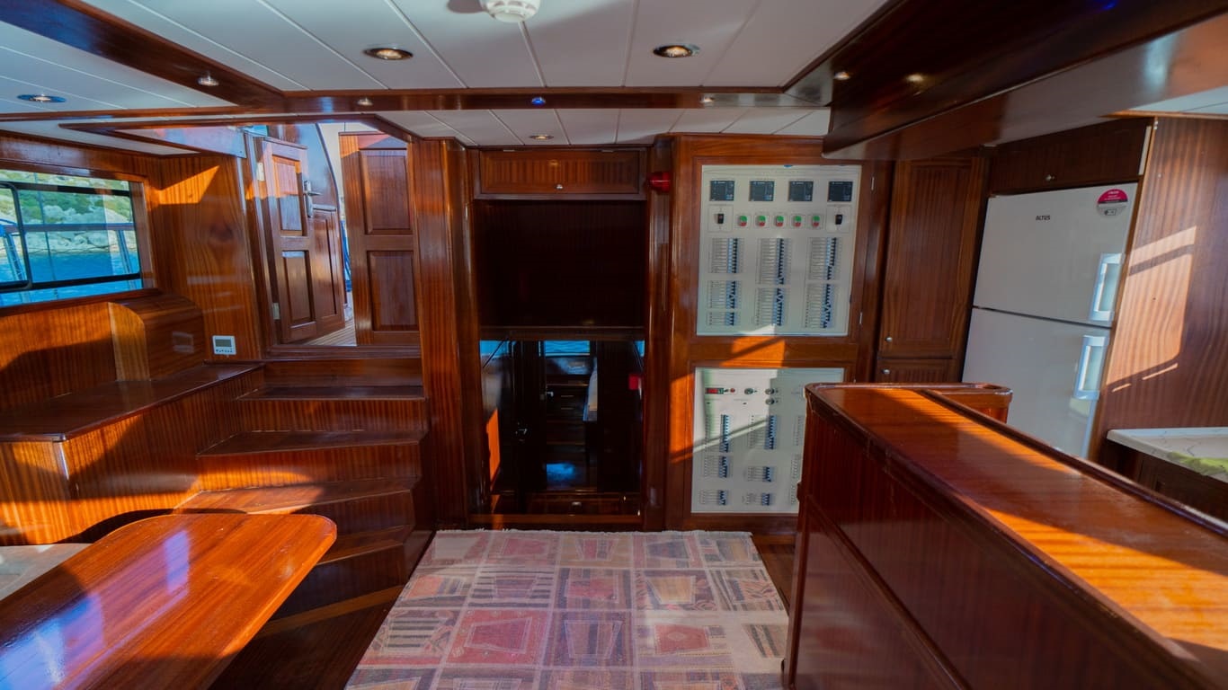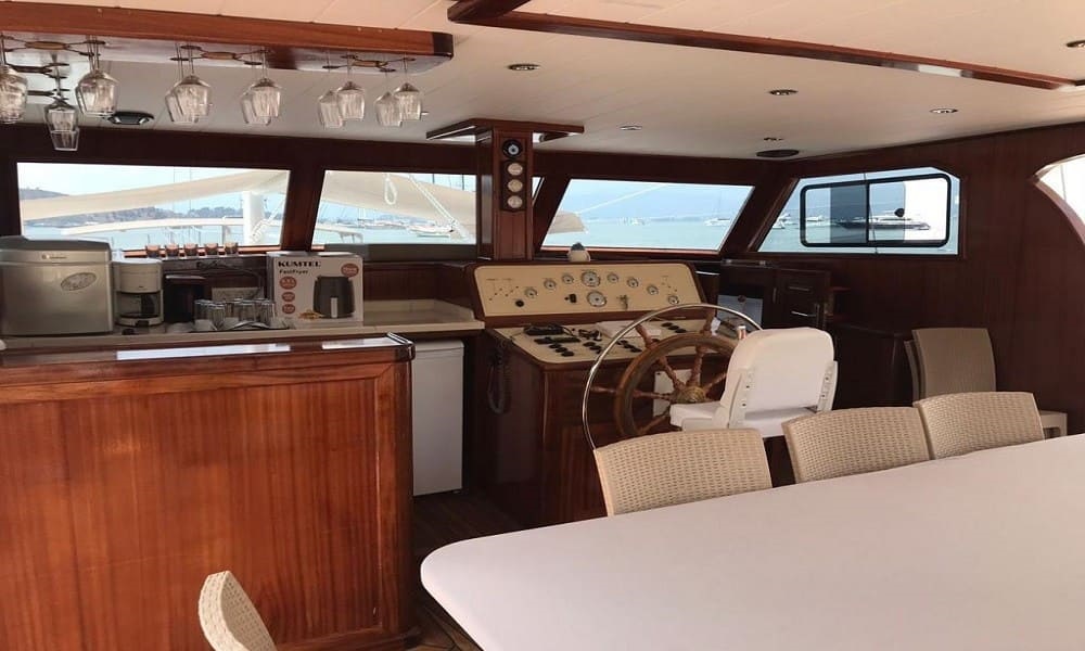 2022 yapımı, 21 metre uzunluğa ve 6,5 metre genişliğe sahip lüks guletimiz Kasapoğlu 6, Fethiye tekne kiralama kategorisinde misafirlerimize sunulan en konforlu seçeneklerden biridir. 2 master ve 2 double kabiniyle toplam 10 kişilik yasal kapasiteye sahip olan teknemiz, her kabinde ev tipi wc, şık duşakabin, klima ve saç kurutma makinesi ile donatılmıştır.