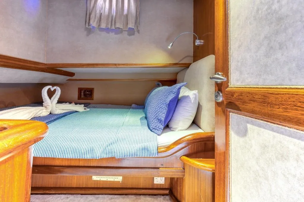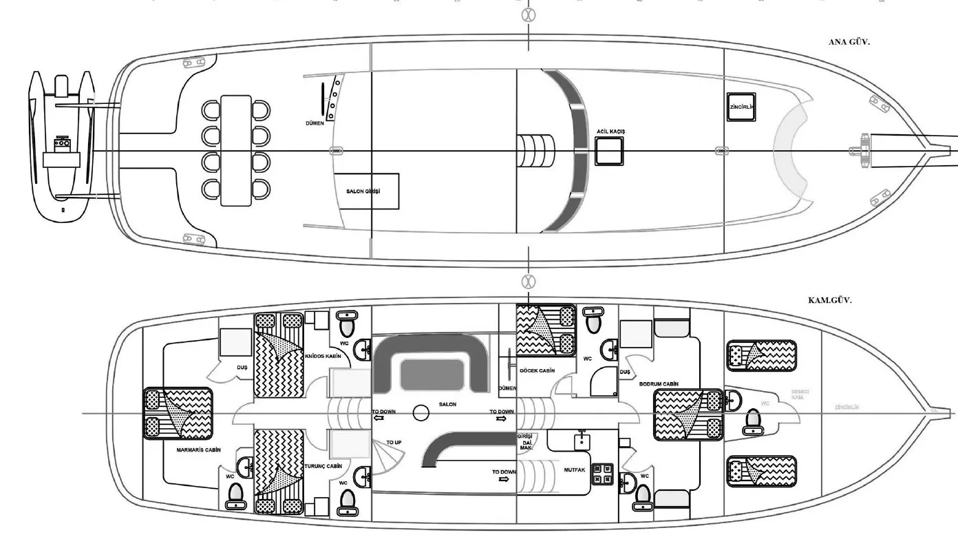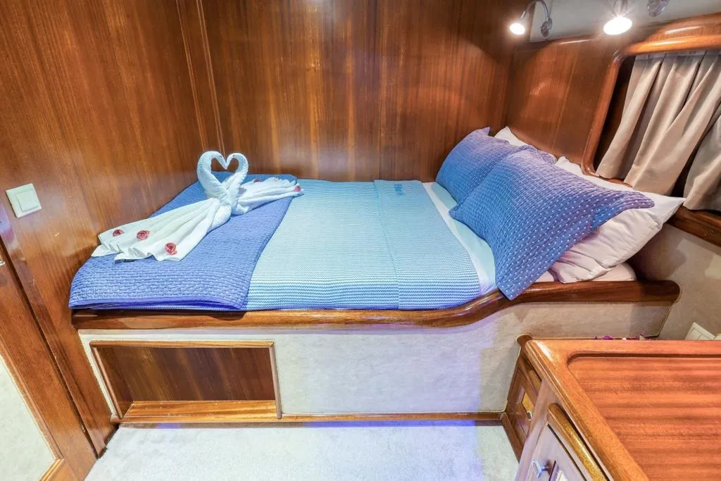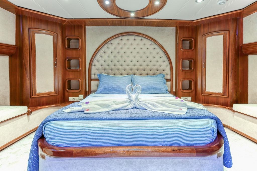 24 metre uzunluğunda ve 6 metre genişliğinde olan teknemiz, 2 master ve 3 double kabiniyle toplam 10 kişilik gruplar için ideal bir konaklama imkânı sağlamaktadır. Tüm kabinlerde klima, duşakabin, ev tipi tuvalet ve özel banyo alanı yer almaktadır.