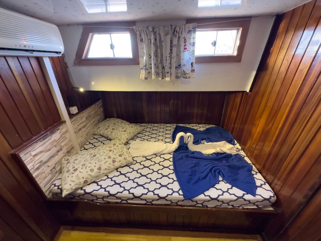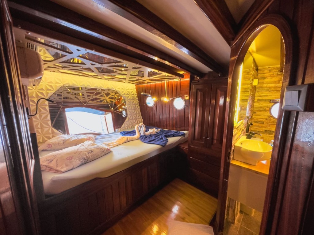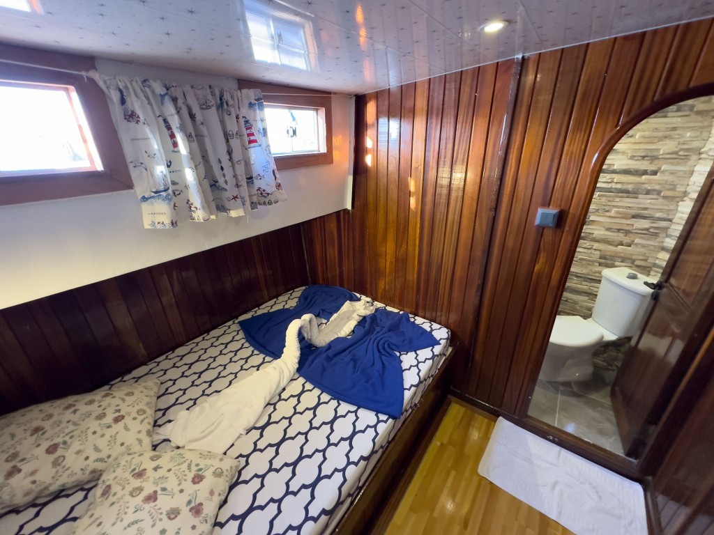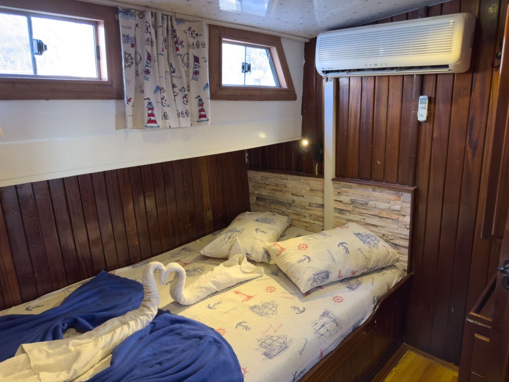 Toplamda 8 kabini bulunan teknemizde, 4 triple ve 4 double kabin olmak üzere 16 misafir ağırlanabilmektedir. Tüm kabinlerde klima, duş ve wc bulunarak misafirlerin rahatlığı ön planda tutulmuştur. Lüks kategorisindeki teknemiz, geniş ve ferah bir salon ile kullanışlı bir güverteye sahiptir.
