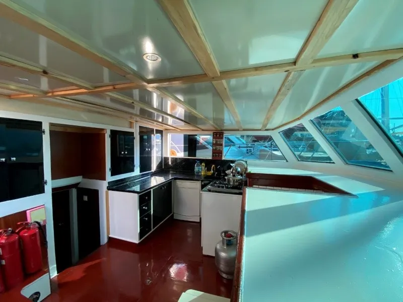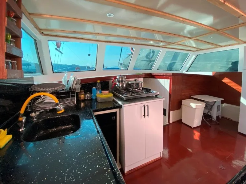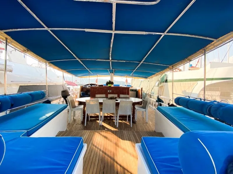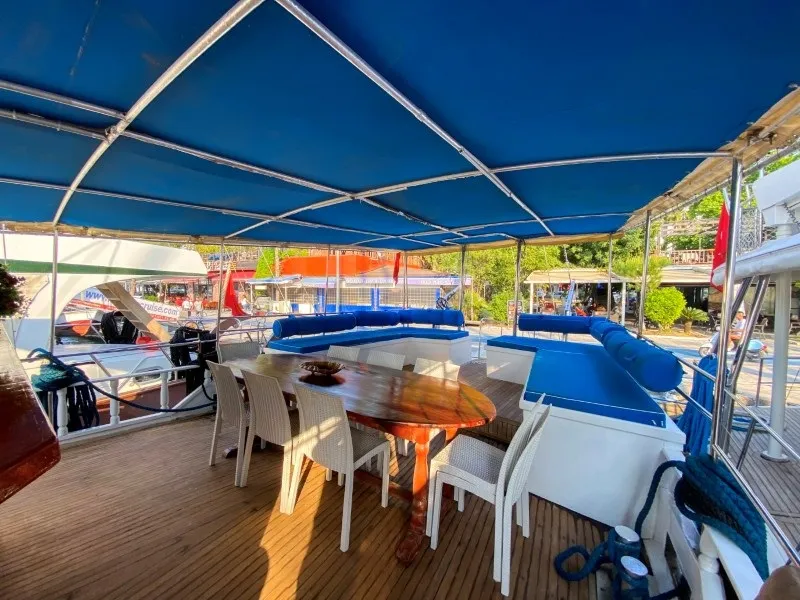 Teknemizin ön güvertesinde geniş bir oturma alanı, güneşlenme minderleri ve açılır-kapanır tente bulunur. Arka güvertede ise oturma grubu, yemek masası, bar ve tente yer almaktadır. Geniş yaşam alanları ve rahat tasarımıyla özellikle Fethiye tekne kiralama tercih eden misafirlerin beğenisini kazanmıştır.
