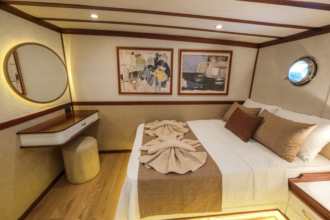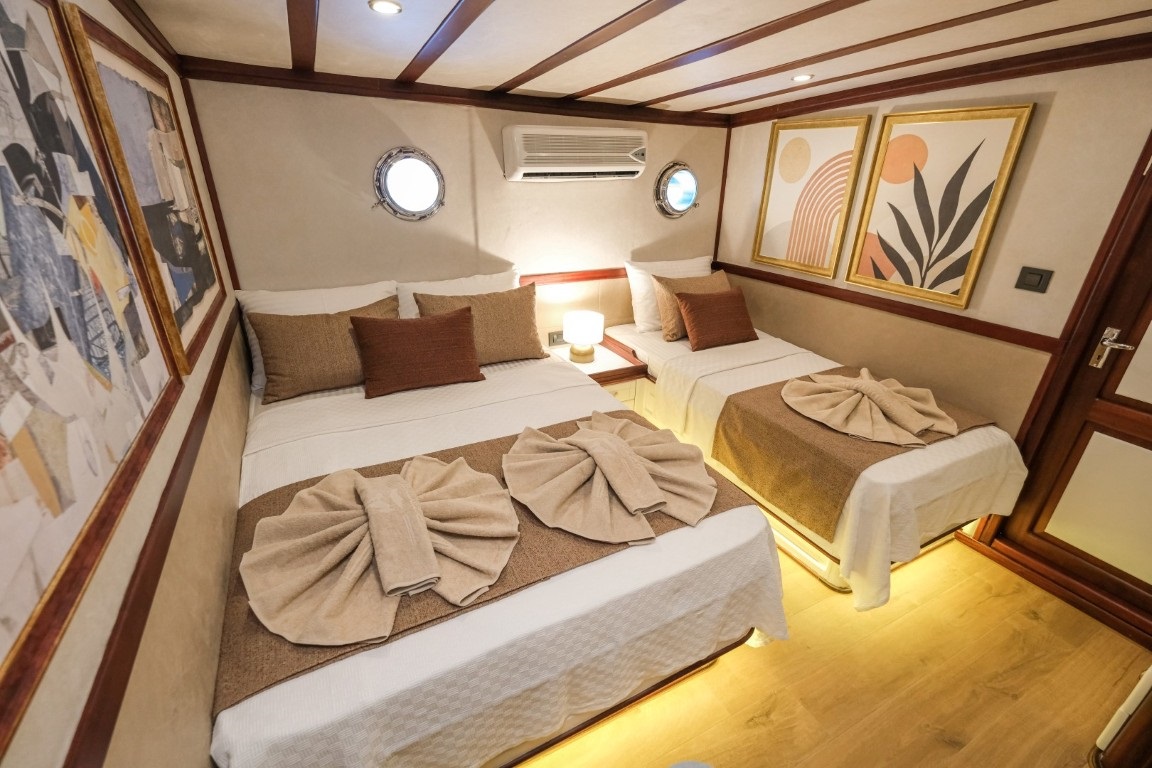 Toplam 8 kabini bulunan teknemiz, 6 double ve 2 triple kabin düzeniyle 18 kişiye kadar konaklama imkânı sunmaktadır. Tüm kabinlerde özel duşakabinli banyolar ve ev tipi tuvaletler yer almakta olup, ferah yaşam alanları uzun süreli mavi yolculuklarda maksimum rahatlık sağlamaktadır. Modern mobilyalarla donatılmış salon alanında bar, yemek masası ve konforlu oturma grupları bulunmakta, tam donanımlı mutfağı ise profesyonel kullanım standartlarını karşılamaktadır.