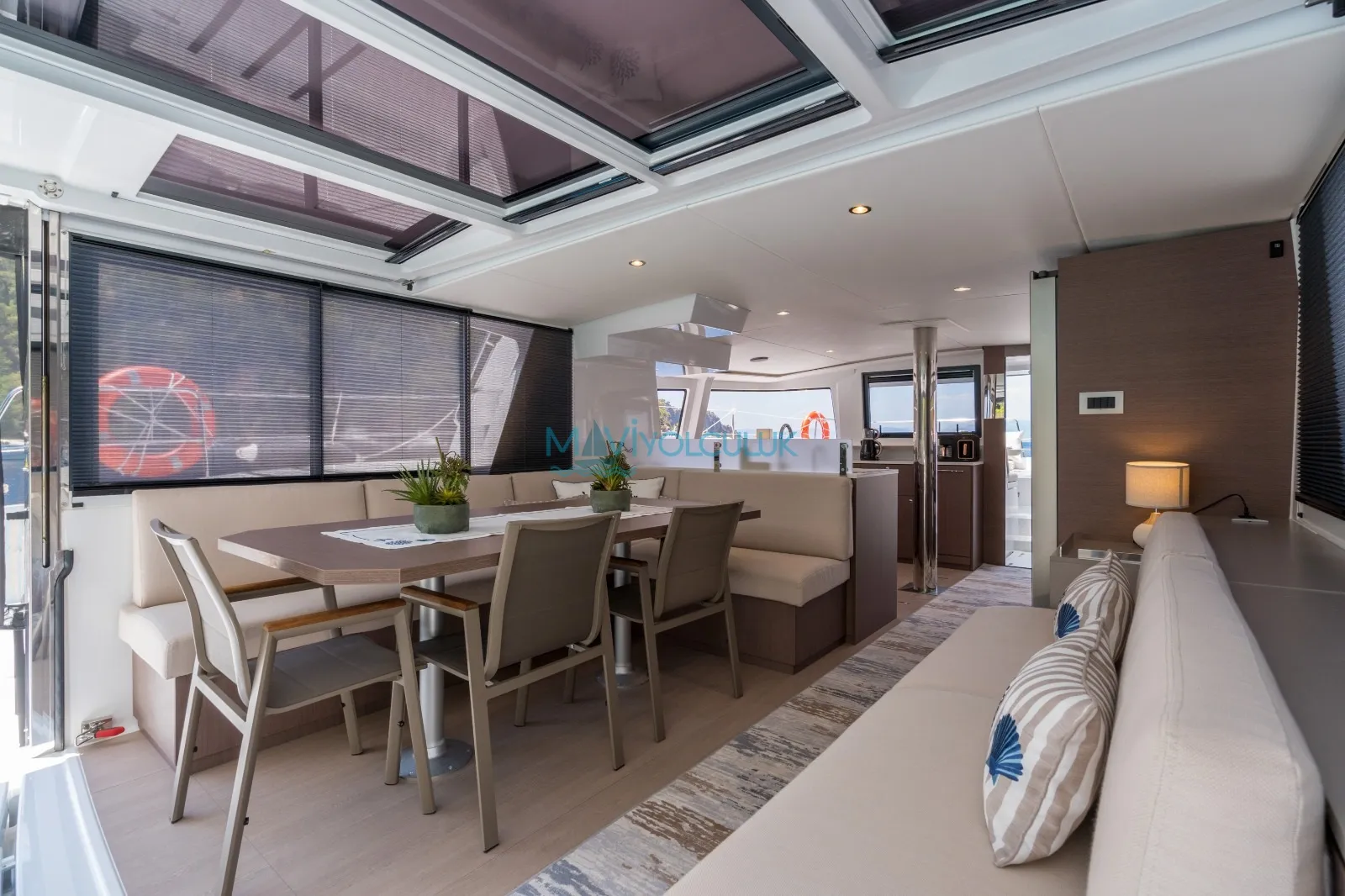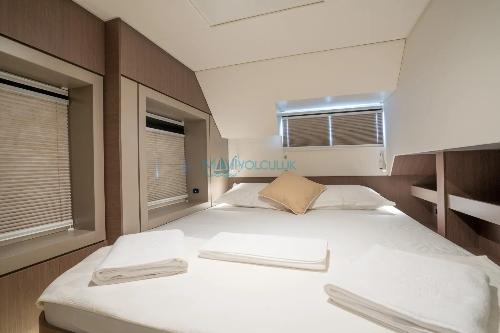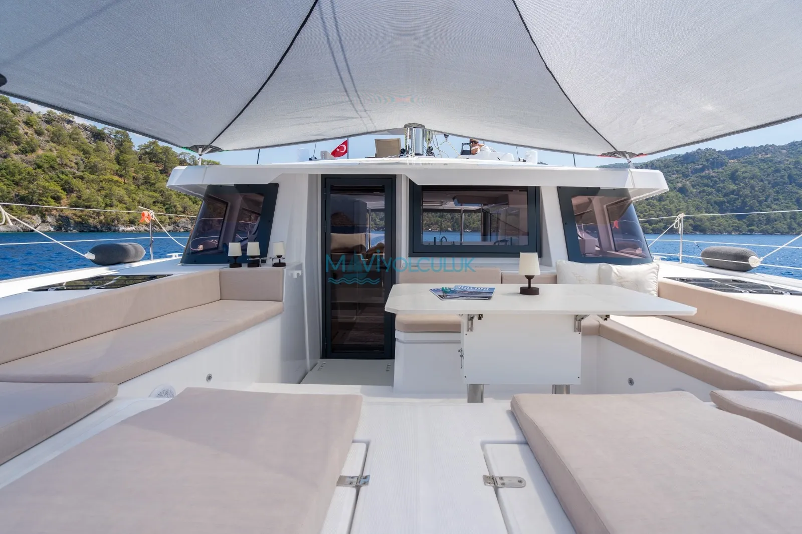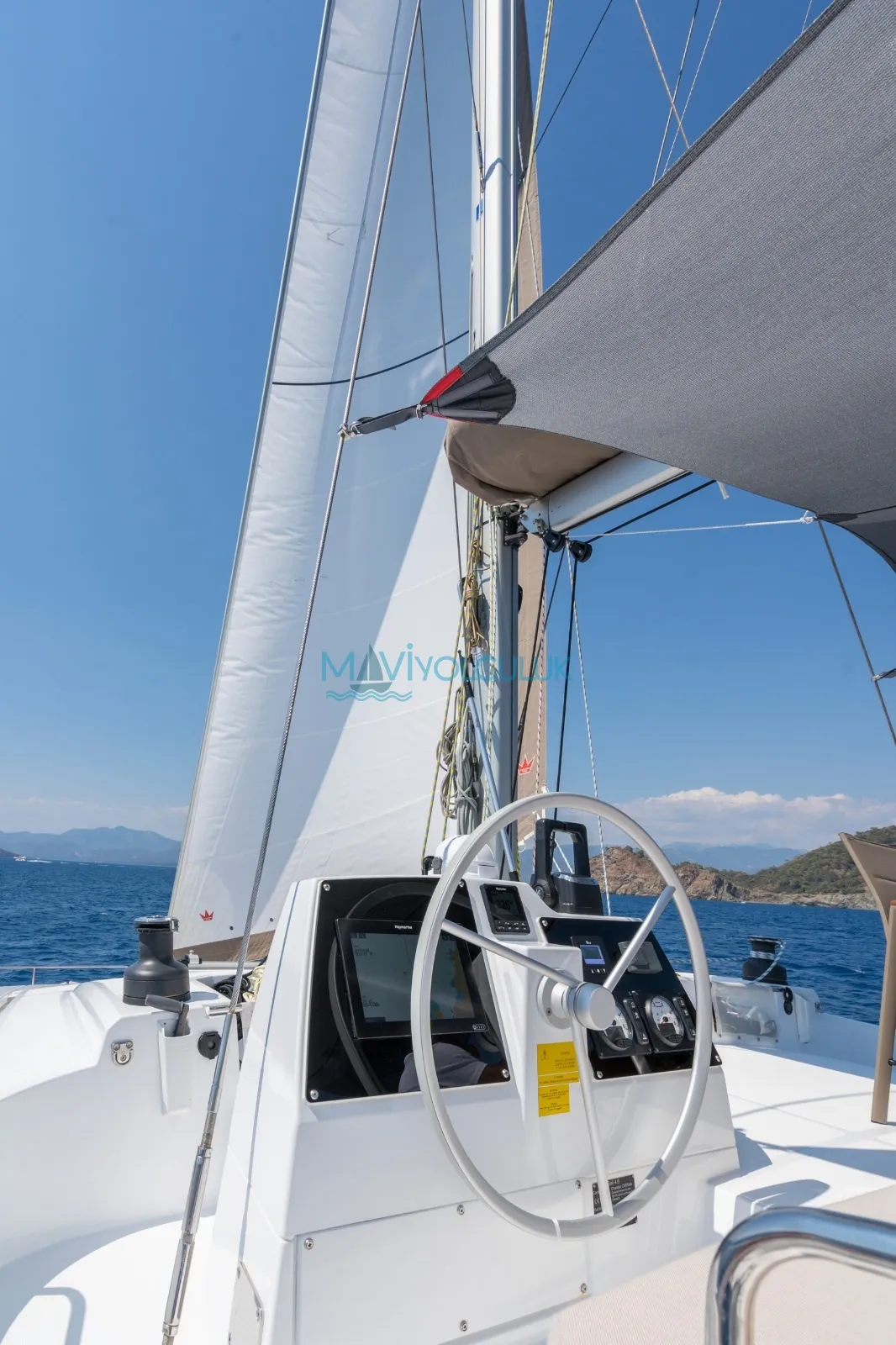 Yelken ve deniz tutkunları için tasarlanmış lüks katamaranımız, 2022 yılında yapımı tamamlanıp denize indirilmiştir. Fethiye kiralık katamaran kategorisinde listelenmiş teknemiz, 14.3 metre uzunluğa, 7.7 metre genişliğe sahiptir. 4 adet double kabiniyle 8 kişilik misafir gruplarını ağırlamaktadır. Gün içinde 4-6 saat klima hizmeti verebilmektedir. Kiralık katamaranda telsiz, gps, pusula, uydu, haberleşme sistemi, elektronik harita, derinlik ölçer cihazları bulunmaktadır.