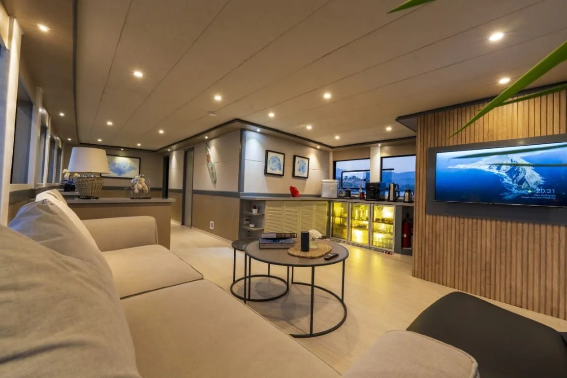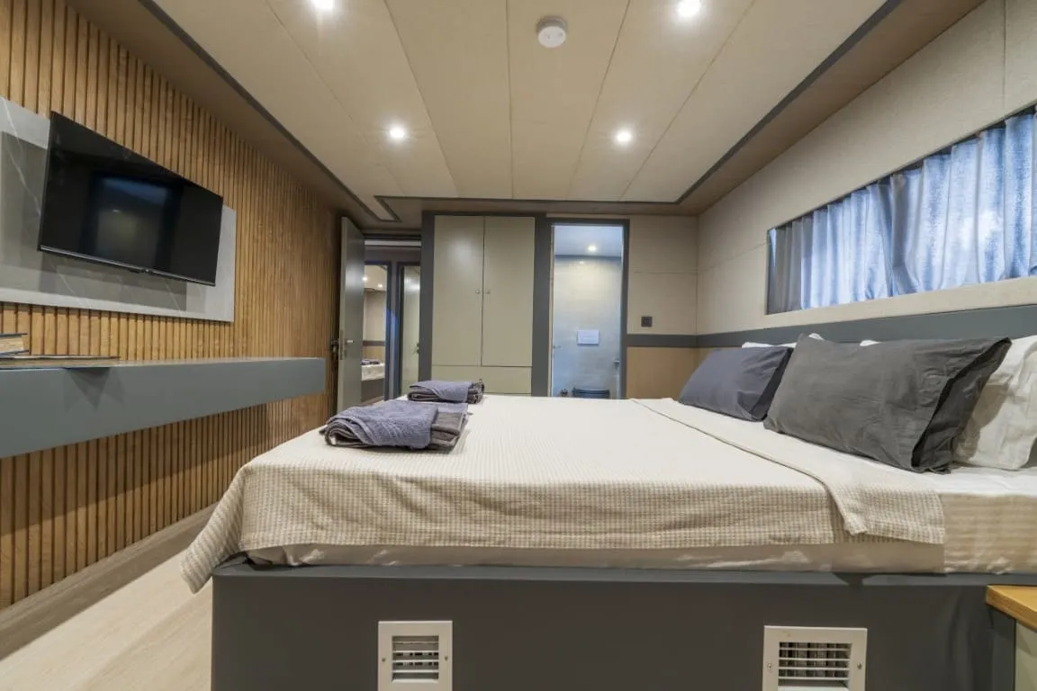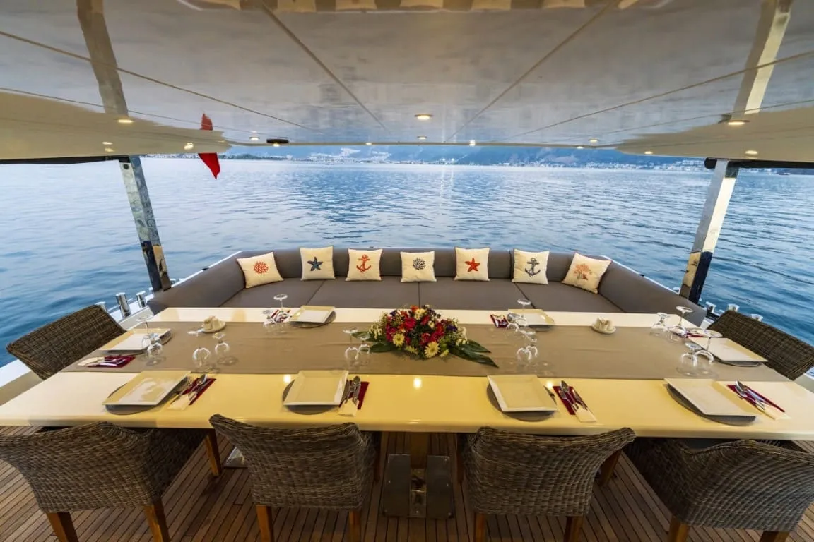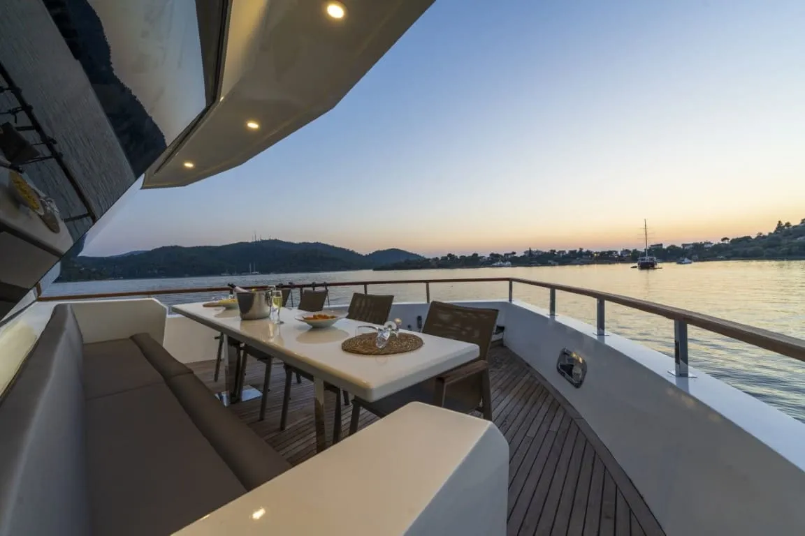 Lüks plus kategorisinde yer alan teknemizde, mürettebat için ayrı yaşam alanları, tam teşekküllü bir mutfak, iç ve dış mekan yemek-dinlenme alanları ve Amerikan tarzı bir bar bulunmaktadır. Üst güverte (flybridge) kısmında tüm misafirlerin rahatça güneşlenebileceği geniş güneş yatakları, konforlu oturma grupları ve yemek masası yer almakta, tatilinize eşsiz bir keyif katmaktadır.