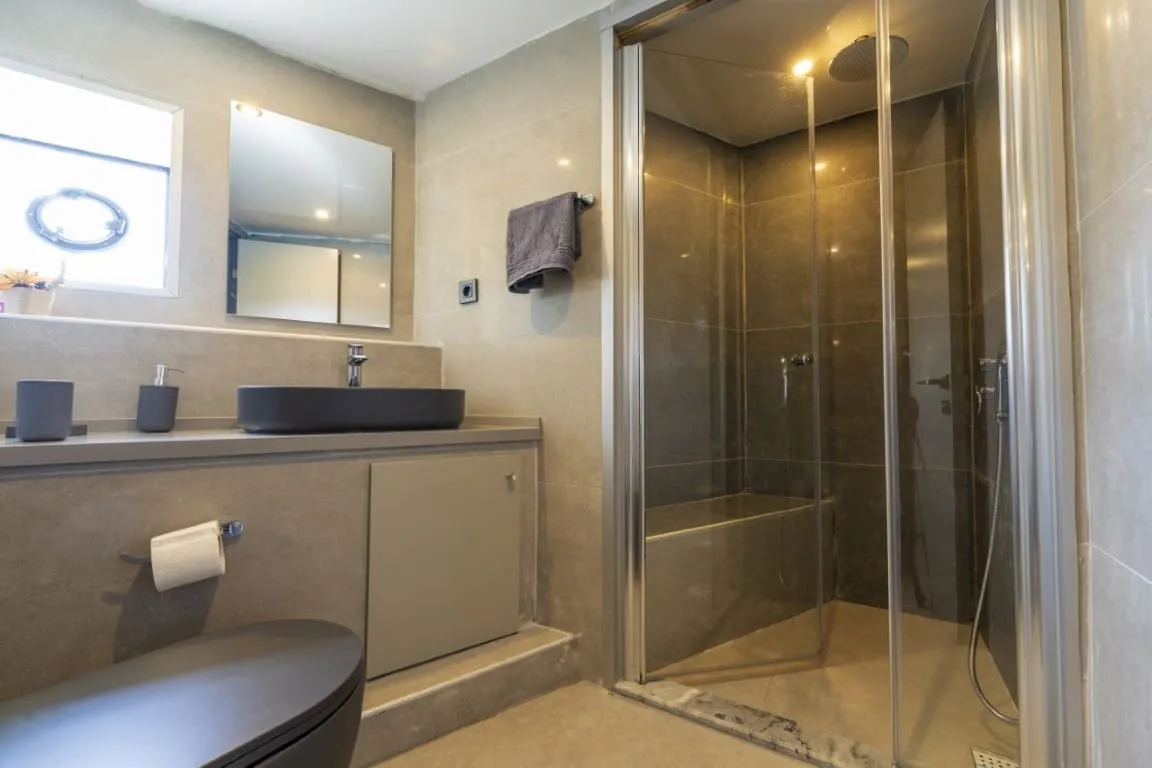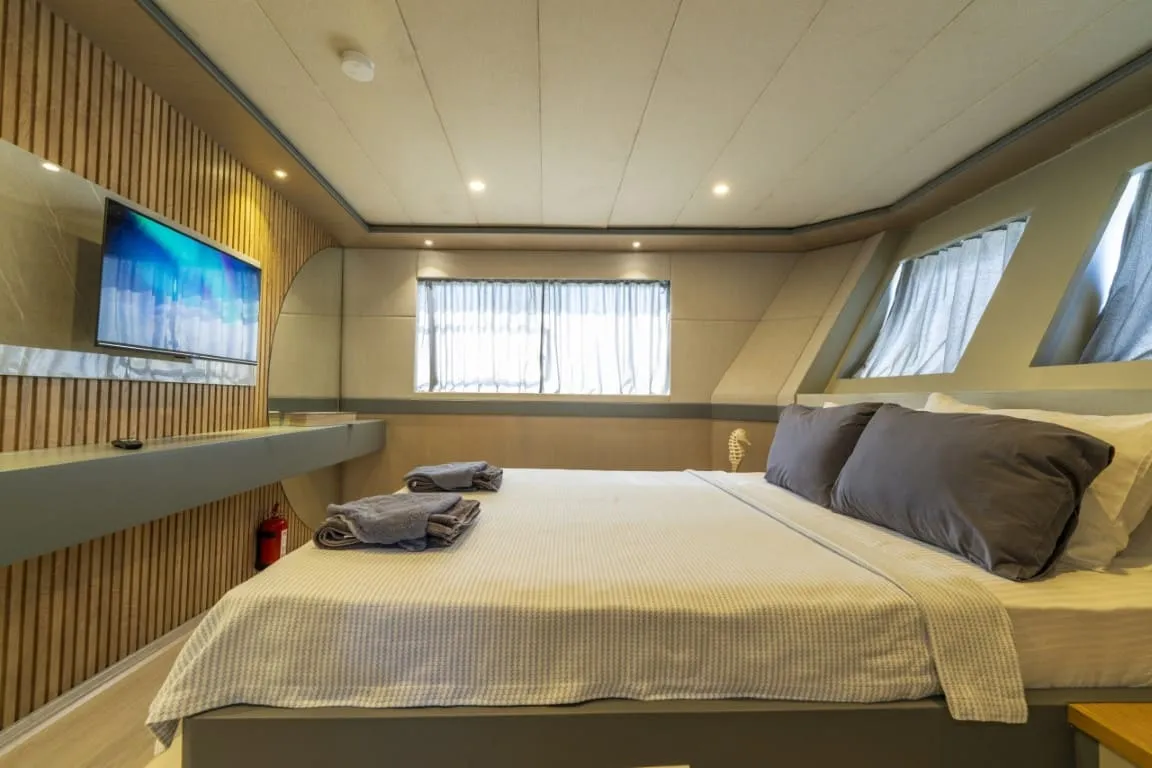 Birbirinden şık ve rahat, kendine ait duş, klima ve wc si bulunan 2 master, 3 double ve 1 twin kabinde toplamda 12 kişilik deniz tutkunu gruplara hizmet vermektedir. Tüm rotalara uygun yat kiralama ayrıcalığını sunan bu teknemiz, misafirlerine farklı limanlardan çıkış imkanı sağlayarak özgür bir tatil deneyimi yaşatır.