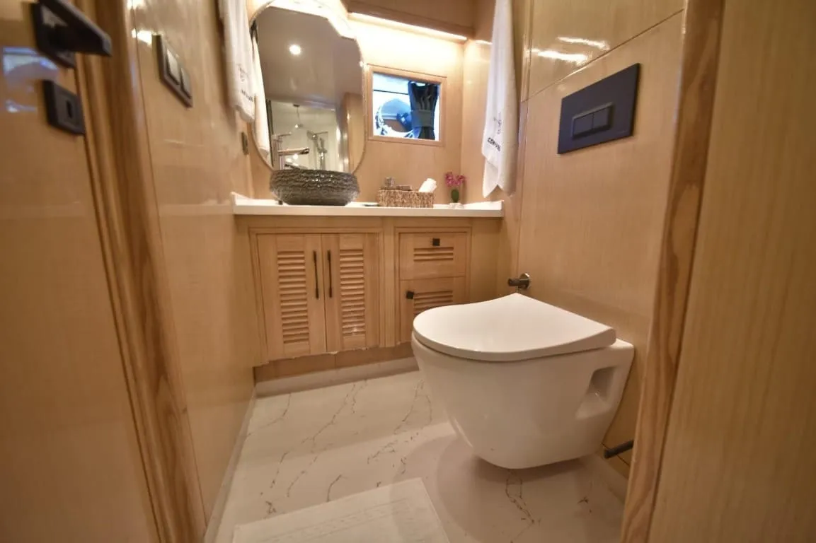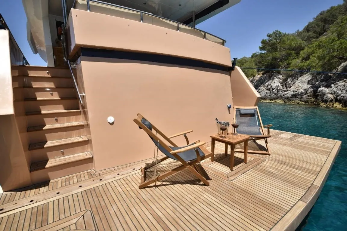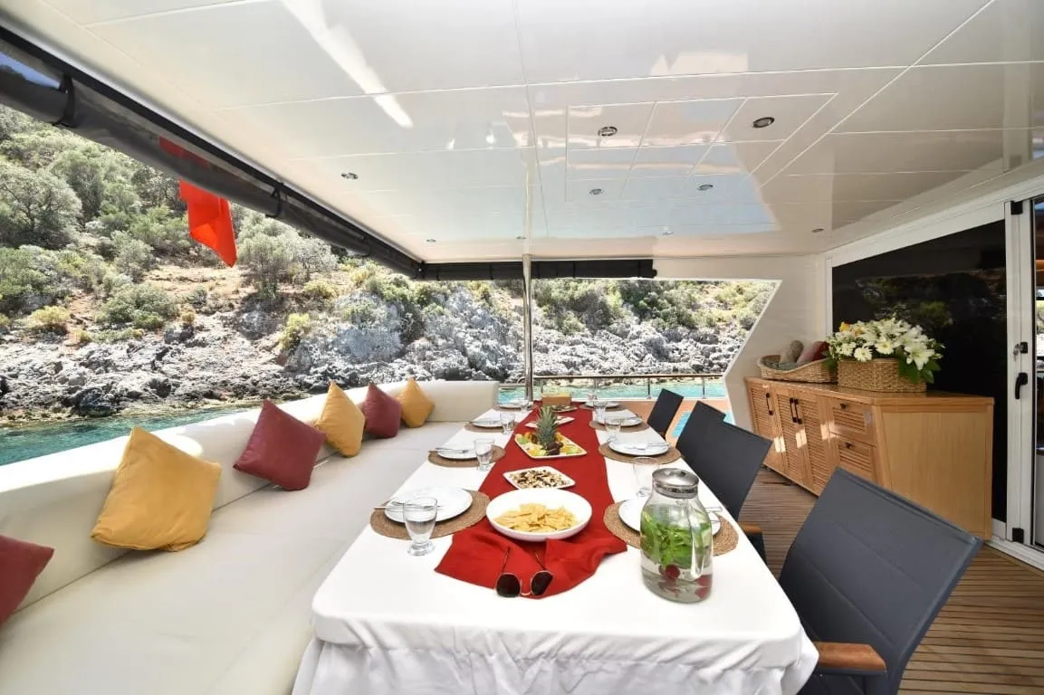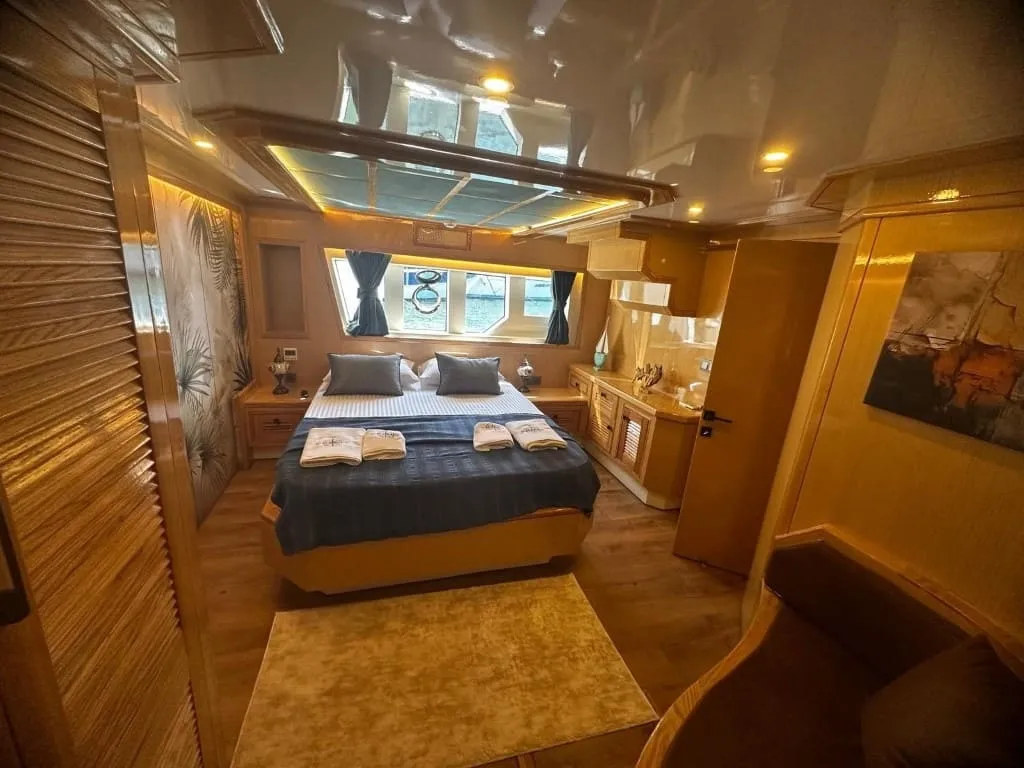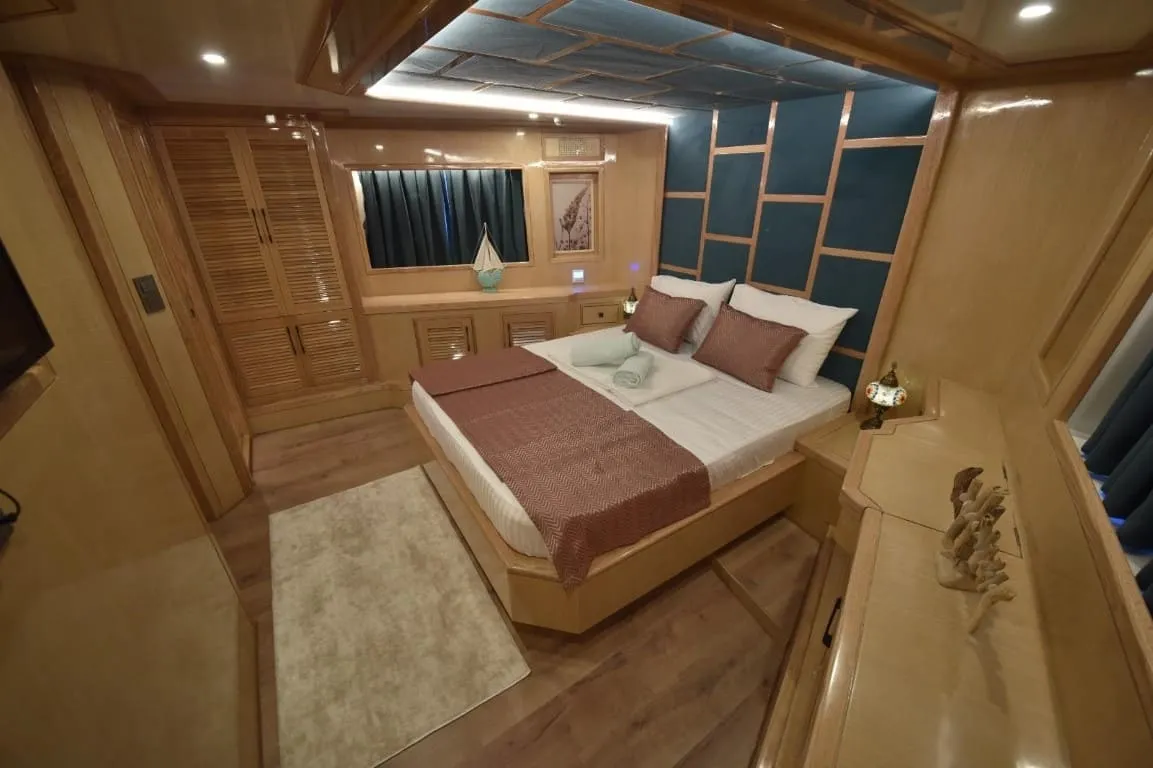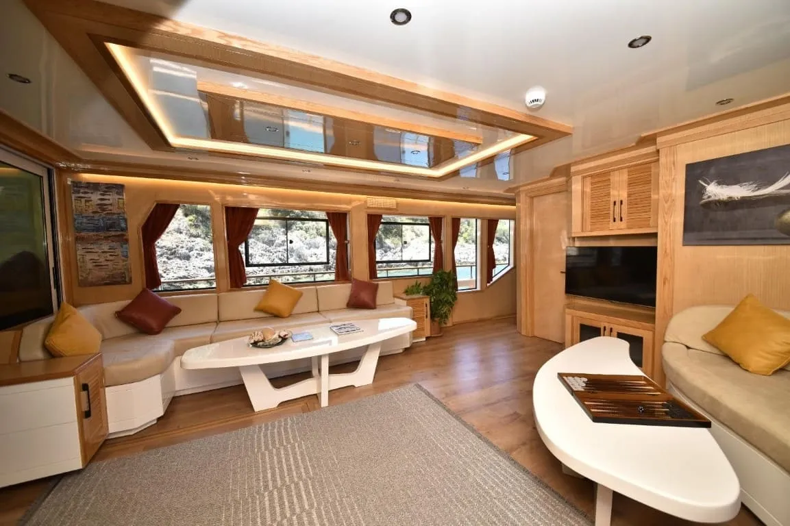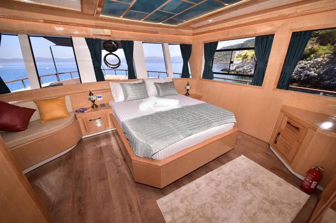Trawler tipi yatları guletlerden ayıran en belirgin özelliklerden biri geniş üst kat ve dik hatlara sahip kabinlerdir. Compass bu özelliğiyle çok daha rahat bir mavi tur tatili imkanı sunar. Açık renk mobilyaları ve modern dokunuşlarıyla, teknemizin iç tasarımı misafirlerimiz tarafından beğeni kazanmıştır.