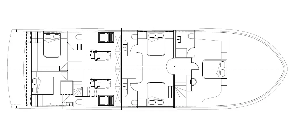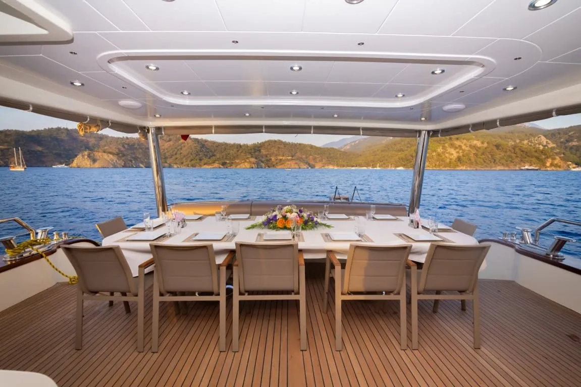 Arka güvertede yer alan geniş oturma grubu, yemek masası ve üst tente, misafirlerin yemeklerini ve sohbetlerini eşsiz manzaralar eşliğinde keyifle geçirmelerini sağlar. Ön güvertede huzurlu bir oturma alanı bulunurken, üst güvertede güneşlenme minderleri, yemek masası ve bar gibi alanlar tatilinizi unutulmaz kılacak şekilde tasarlanmıştır.