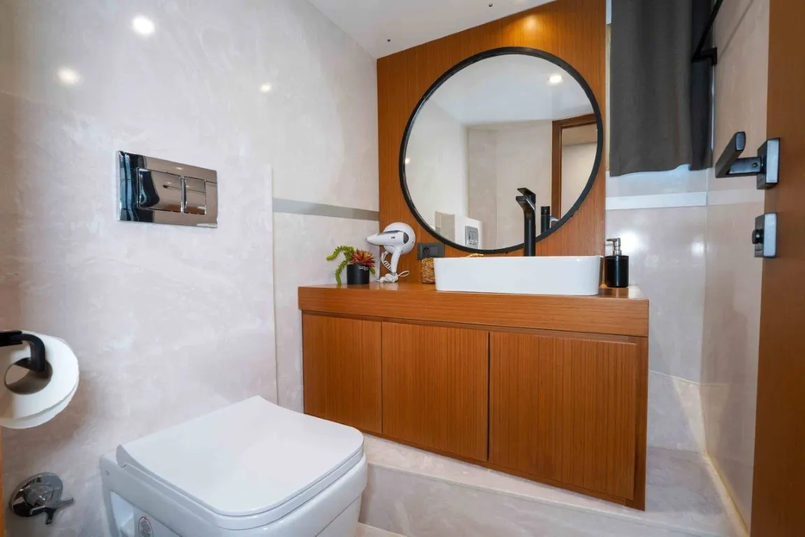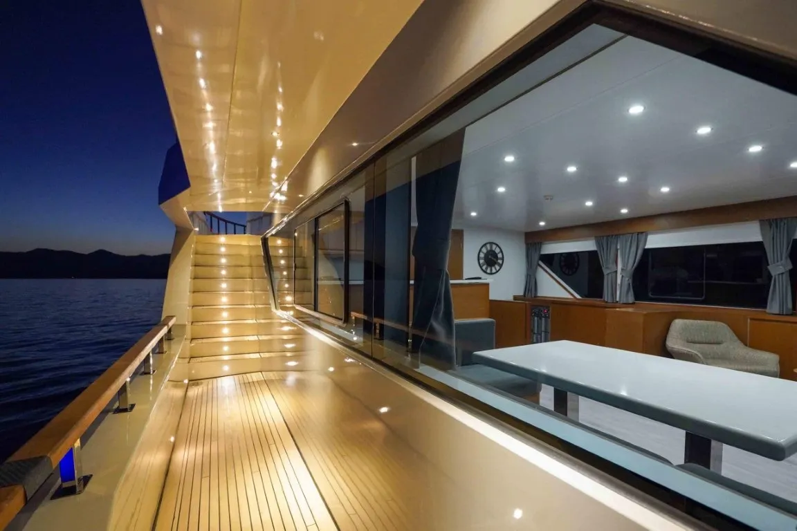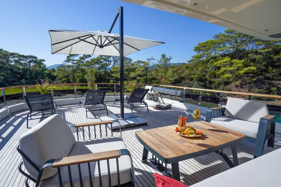 Trawler kiralama seçenekleri arasında öne çıkan teknemizin flybridge bölümü ise tatilinizin en keyifli alanlarından biri olacaktır. Bu bölümde şezlonglar, masa, sandalyeler ve çiçek dekorlarıyla huzurlu bir teras atmosferi sağlanırken, ön kısımda yer alan konforlu oturma grubu ise trawler tipi yatlardaki seyir keyfinin ayrıcalığını size yaşatacaktır. Delüks yat kategorisinde yer alan bu özel tekne, hem şıklığı hem de rahatlığıyla beklentilerinizi fazlasıyla karşılayacaktır. Detaylar ve güncel müsaitlik durumunu öğrenmek için maviyolculuk.org üzerinden tekne kiralama departmanımızla iletişime geçebilir, size özel fiyat avantajlarından faydalanabilirsiniz.