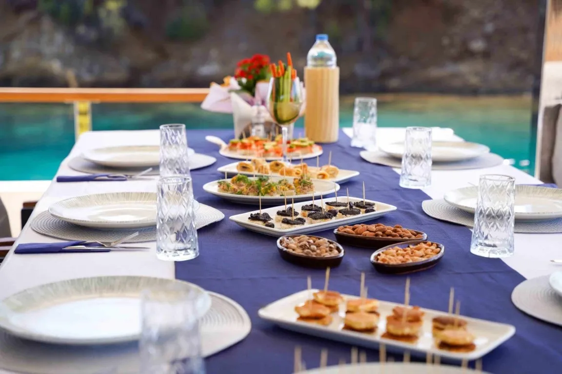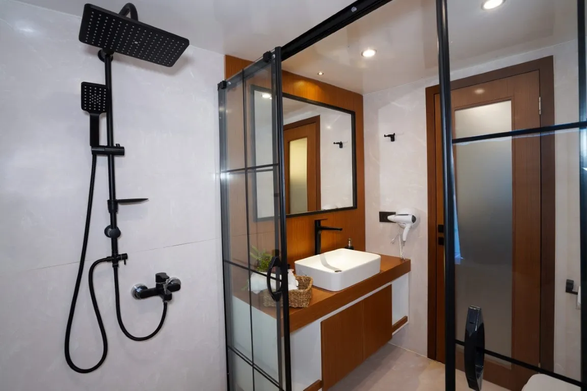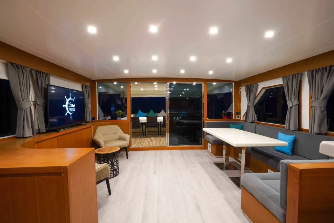 Ana güvertede yer alan yemek masası ve geniş oturma alanı, keyifli akşam yemekleri için idealdir. Ayrıca bu güvertede, çoğu otelden daha geniş ve konforlu olan özel bir kabin yer almakta olup, geniş pencereleri sayesinde misafirlerine hafızalardan silinmeyecek manzaralar sunmaktadır. Alt katta ise konforlu tasarımıyla öne çıkan diğer 4 kabin bulunmaktadır. Tüm kabinlerde duşakabin, saç kurutma makinesi, güvenlik kasası, uydu bağlantılı televizyon ve 24 saat çalışan klima hizmeti mevcuttur.