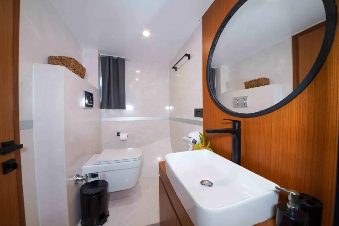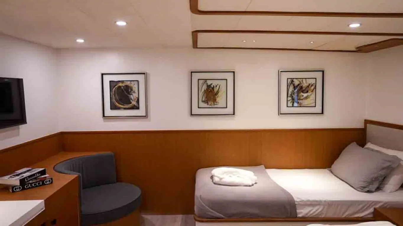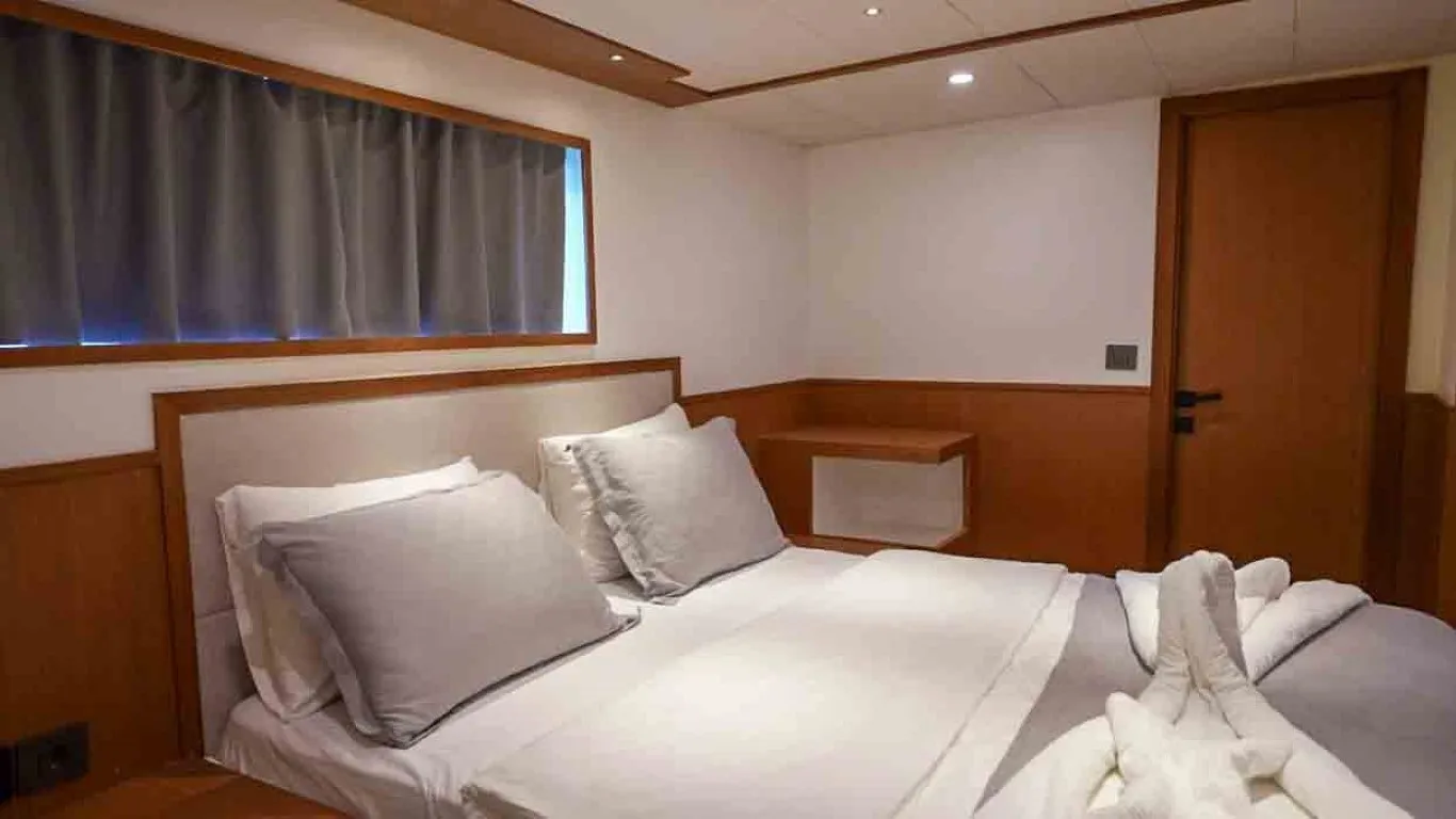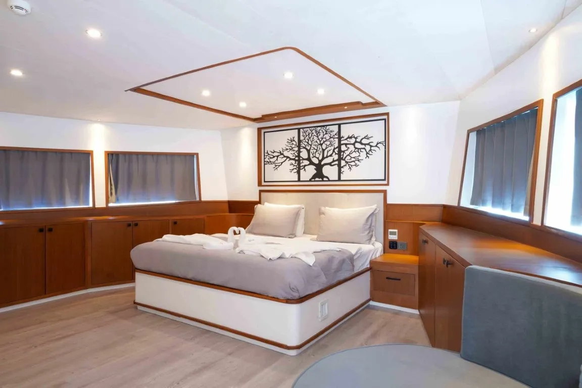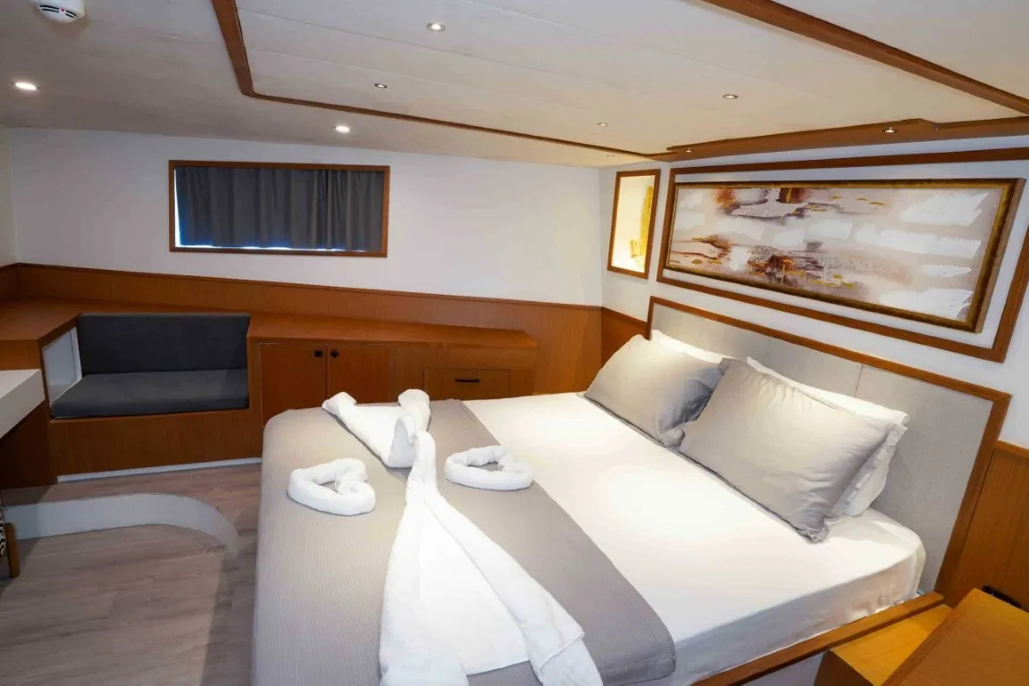Teknemizde 1 master, 2 double, 1 triple ve 1 VIP olmak üzere toplam 5 kabin bulunmaktadır. Maksimum 11 kişiye kadar olan aile, iş veya arkadaş grupları için konforlu konaklama imkanı sağlanmaktadır. 24 saat hizmet verebilen klima sisteminin yanı sıra, deneyimli 4 kişilik mürettebatımız tatiliniz boyunca size profesyonel hizmet sunacaktır.