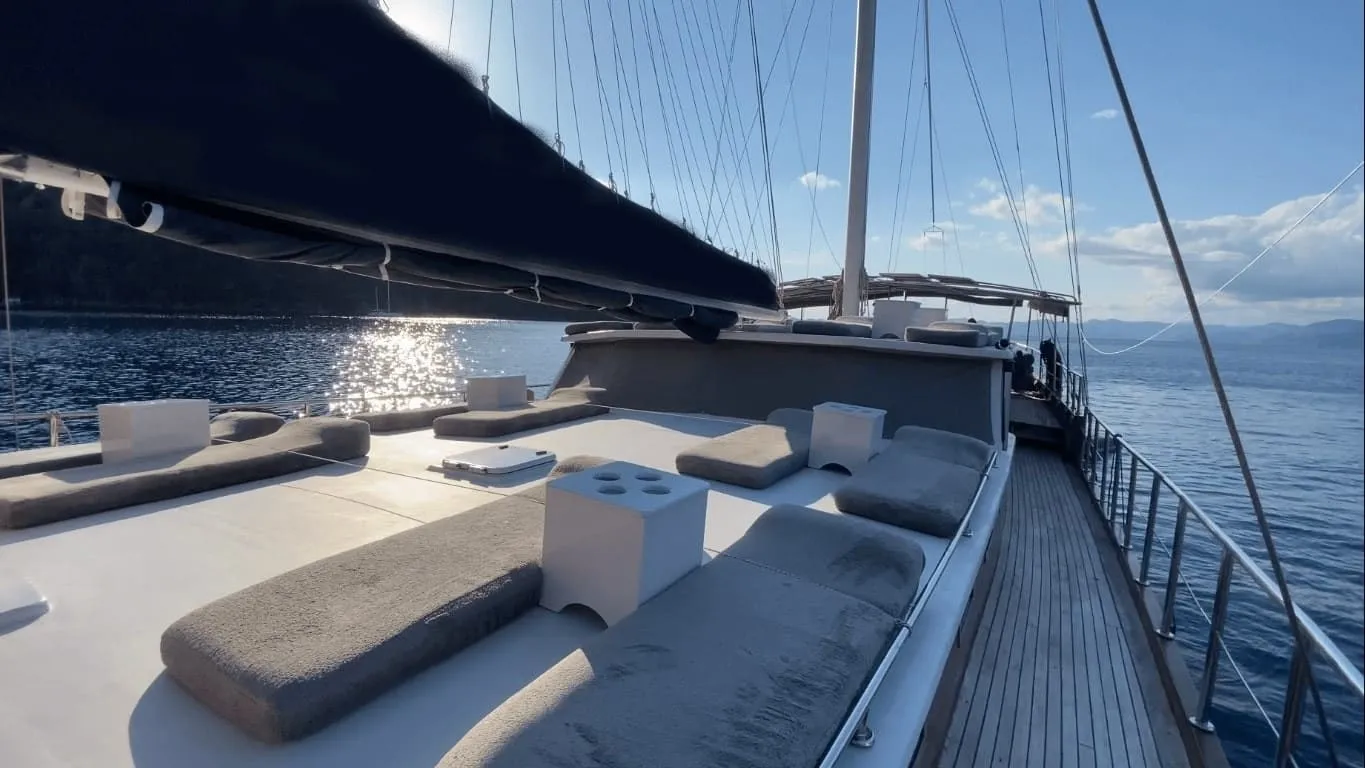 Geniş yaşam alanlarıyla dikkat çeken Aria Gulet, ön güvertede güneşlenme minderleri ve bardaklıklarıyla konforu artırırken, üstü açılabilen oturma grubu ile gün boyu dinlenme imkânı sunar. Flybridge alanı, seyir esnasında ya da gün batımında keyifli vakit geçirmek isteyen misafirler için mükemmel bir atmosfere sahiptir.