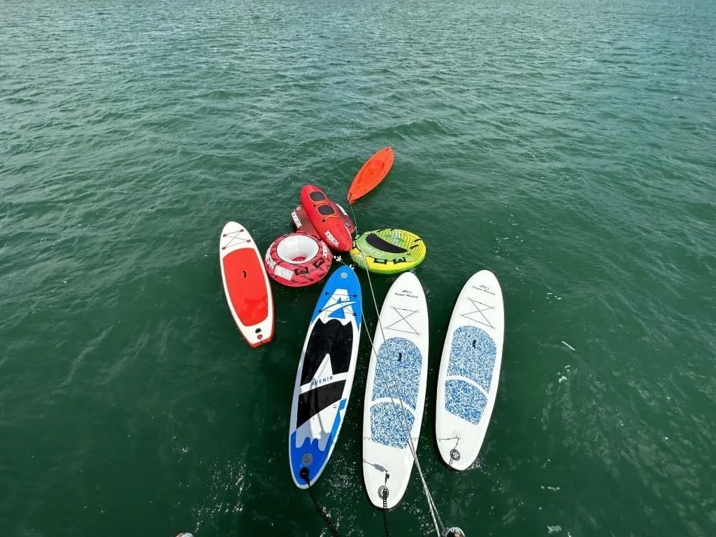 Arka güvertede geniş bir dinlenme alanı ve büyük bir yemek masası bulunurken, Aria Gulet’i benzerlerinden ayıran en önemli özelliklerden biri su sporlarındaki donanımıdır. Standartların çok üzerinde bir hizmet sunan teknemizde, 4 adet paddleboard (SUP), kano, ringo ve banana gibi aktiviteler ile tatilinize eğlence katabilirsiniz.