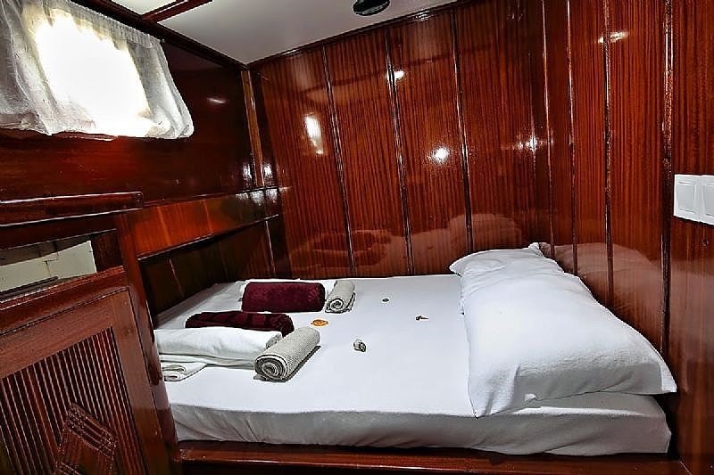 Guletimiz 1 ana kamara ve 2 double kamara olmak üzere toplam 3 kabinli tekne olarak 6 kişilik kapasiteye sahiptir. Baş kamaradaki oturma grubu yatağa dönüştürülerek kapasite 7 kişiye kadar çıkarılabilir. Tüm kamaralarda duş, tuvalet ve klima mevcuttur.