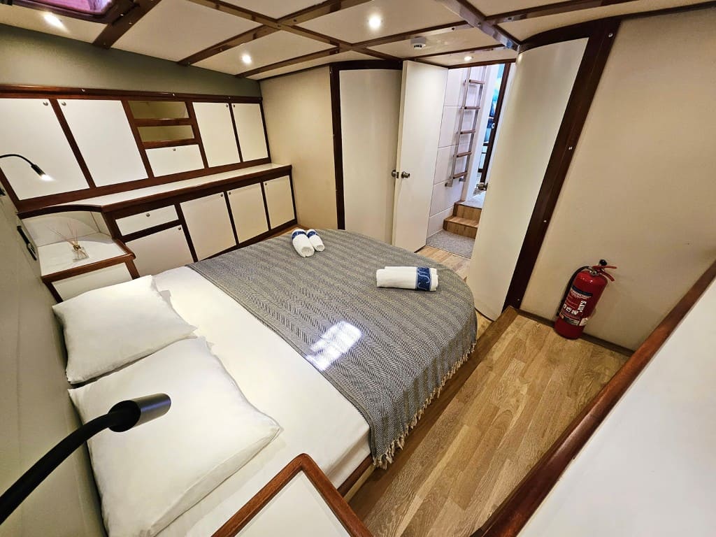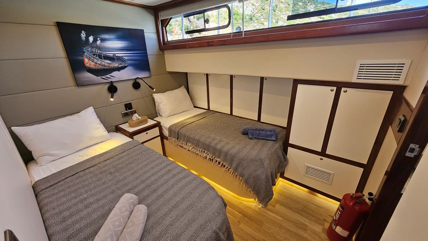 Teknede toplamda 4 kabin bulunmaktadır. 1 master, 1 double ve 1 twin kabin ile misafirlerini ağırlayan Arni Guleti, konforlu konaklama imkanı sunar. Tüm kabinlerde özel banyo, ev tipi tuvalet yer almaktadır. Geniş güverte alanları ise güneşlenme minderleri ve rahat oturma grupları ile donatılmıştır. Gün içinde 6-8 saat klima hizmeti veren gulet, gece klima kullanımına da uygundur.
