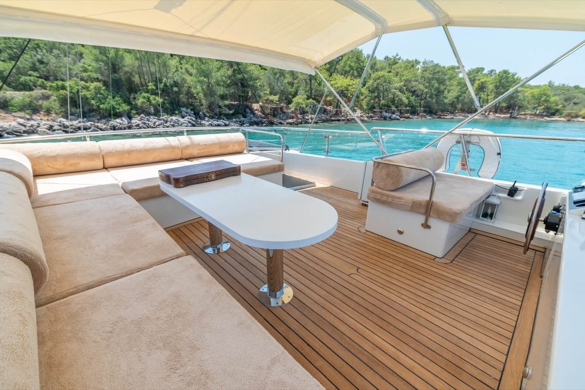 Teknenin arka güvertesinde geniş bir oturma grubu, yemek masası, üst tente ve yan tente yer alır. Ön güvertede ise şezlonglar, oturma alanı, plaj havluları ve açılır kapanır tente ile rahatlatıcı bir güneşlenme alanı bulunur. Üst güverte ise dümen bölümüyle birlikte oturma ve yemek alanı sunar, aynı zamanda tente ile gölgelendirilmiştir.