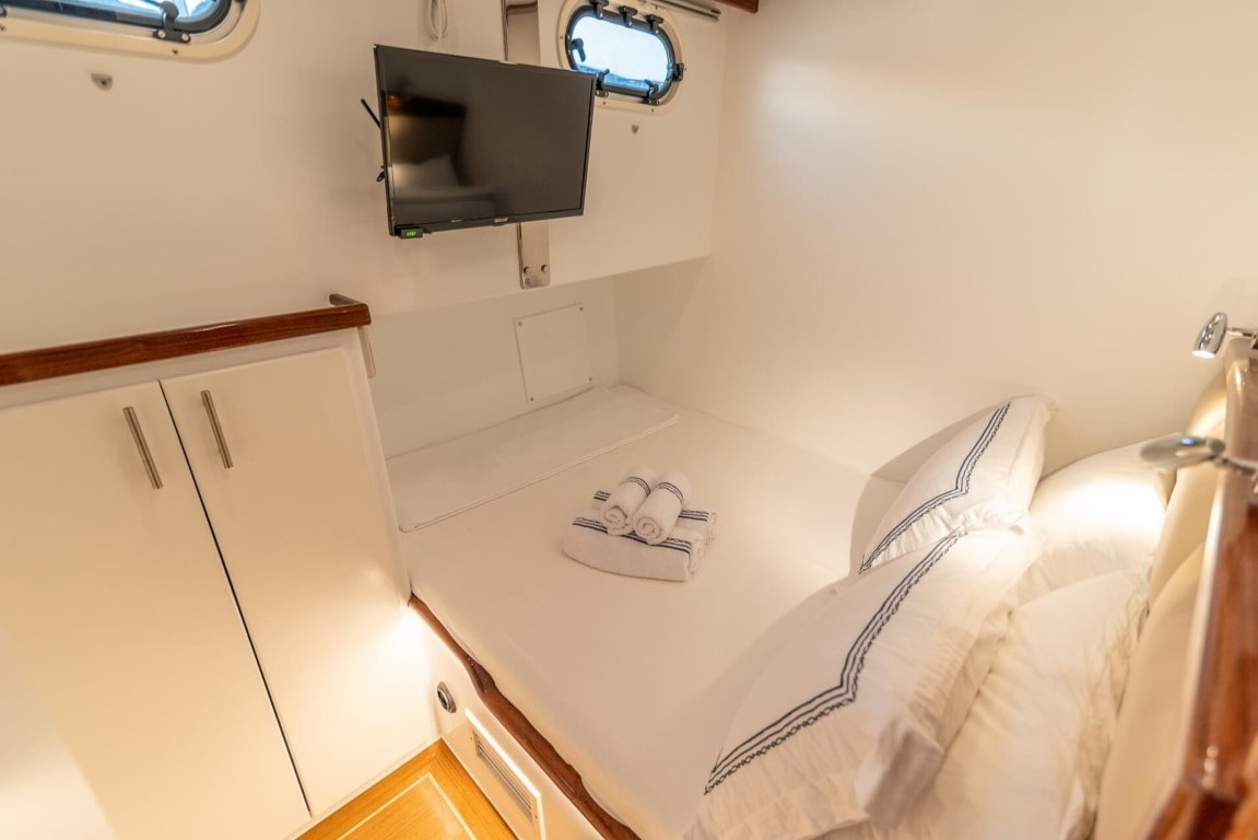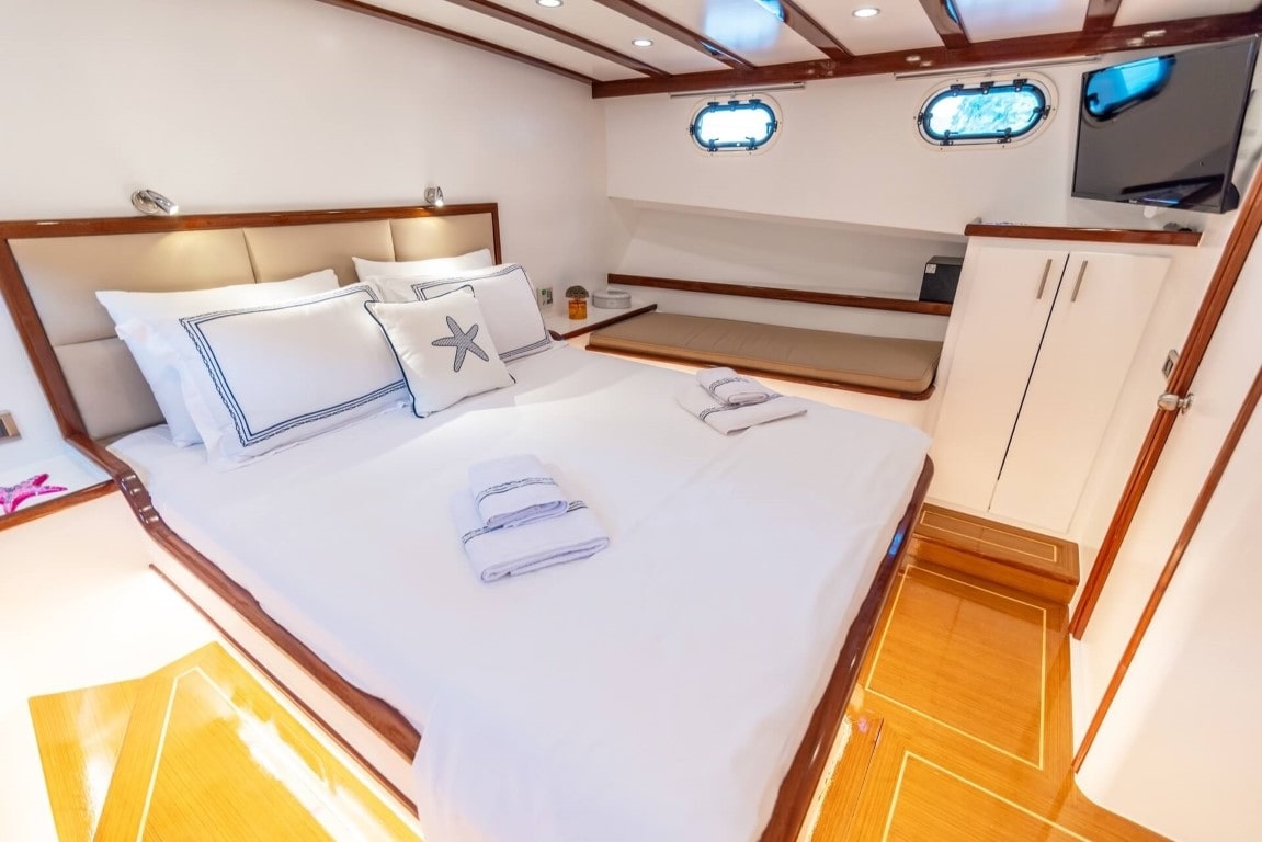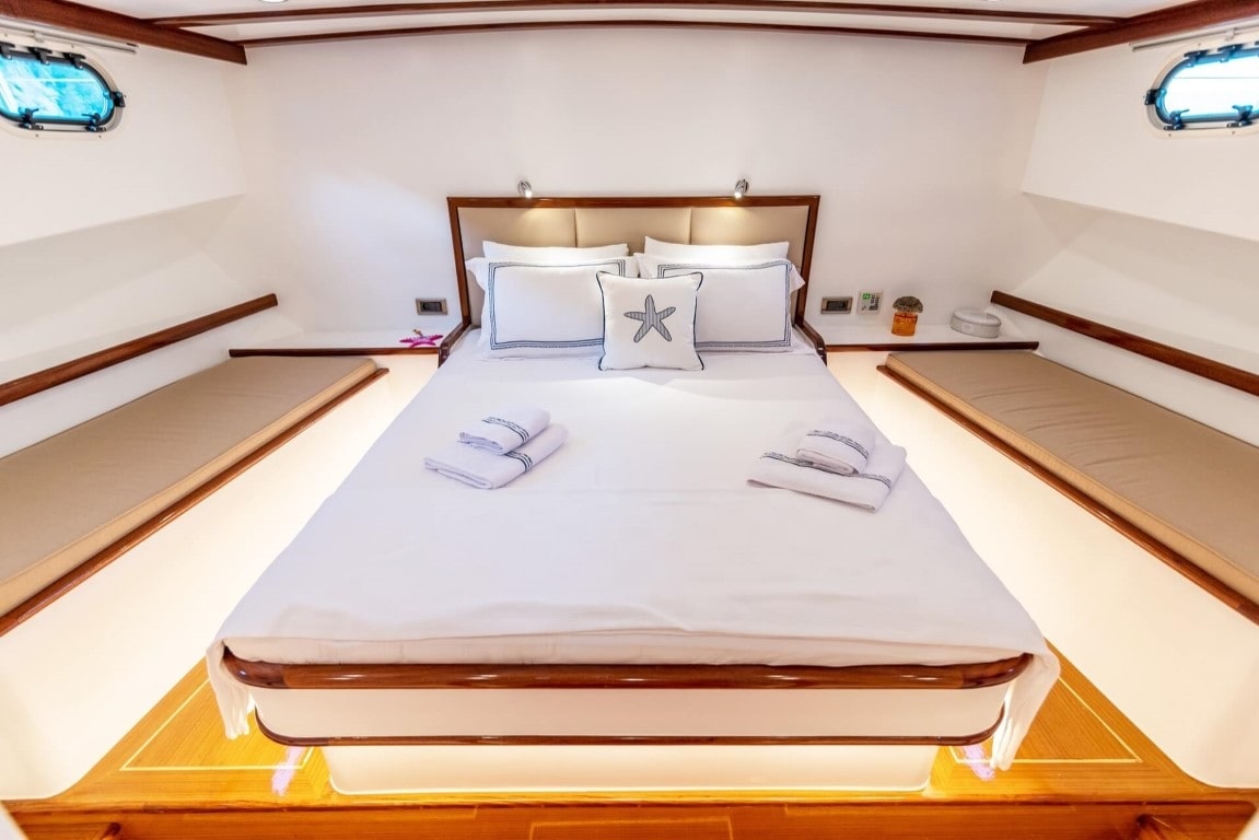 Teknede 1 master ve 2 double olmak üzere toplam 3 kabin bulunuyor. Her kabin özenle tasarlanmış ve misafirlerin konforu ön planda tutulmuştur. Bu donanımıyla Bernis, rahat bir konaklama arayanlar için klimalı tekne kategorisinde öne çıkan bir tercihtir. Klima kullanımı gündüz 4-6 saat arasında sağlanmaktadır. Yelken sistemi yenilenmiş olup Cenova yelken donanımı ile seyir keyfi daha da artmaktadır.