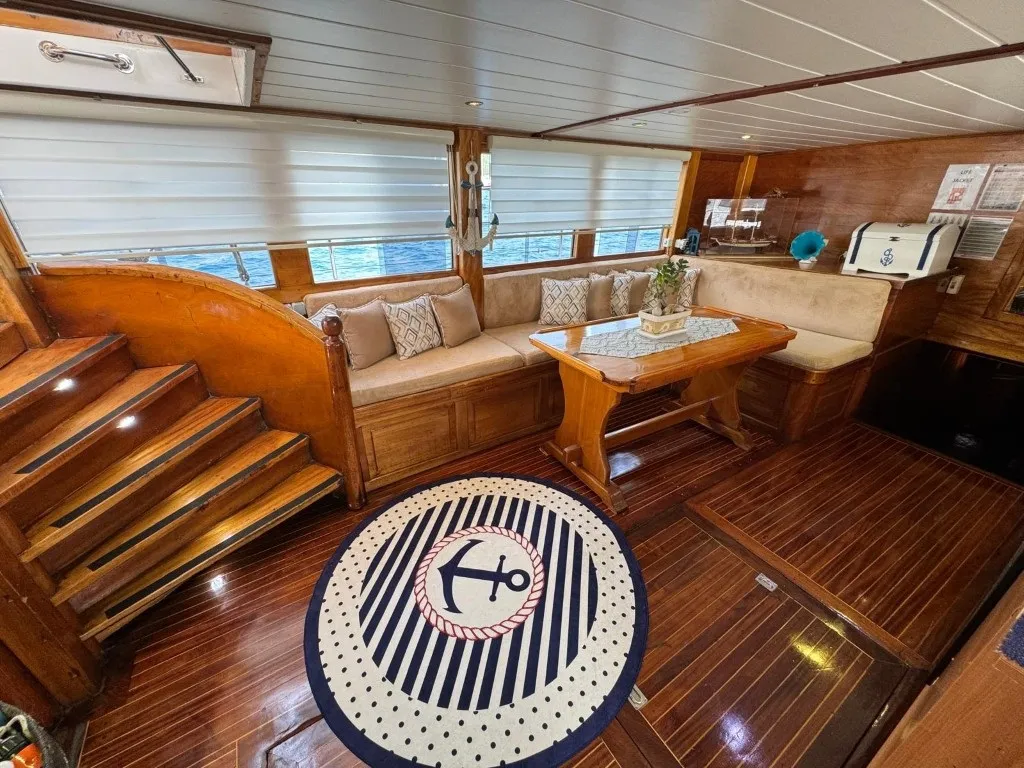 Teknenin ön kısmında, tüm misafirlere yetecek sandalye, güneşlenme minderleri, bar ve geniş bir yemek masası bulunmaktadır. Arka kısmında ise konforlu ve geniş bir oturma alanı, büyük bir yemek masası yer almaktadır. Feronia Gulet’te, deneyimli ve özveriyle çalışan 1 kaptan, 1 aşçı ve 2 gemici sizlere mavi yolculuk tatili boyunca hizmet vermektedir. Mavi yolculuk severler, bu ekonomik gulet kiralama deneyimi ile denizle iç içe, doğayla huzurlu bir tatil geçirebilirler. Eğer siz de unutulmaz bir tatil deneyimi yaşamak istiyorsanız, maviyolculuk.org satış temsilcimizle iletişime geçebilir, sunduğumuz avantajlı fiyatlarla gulet kiralama fırsatlarından faydalanabilirsiniz.
