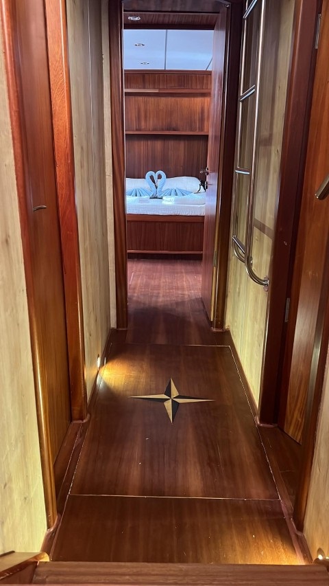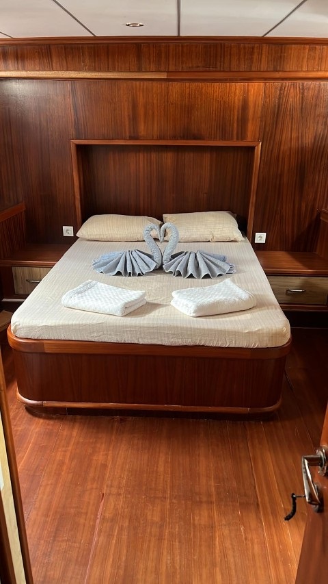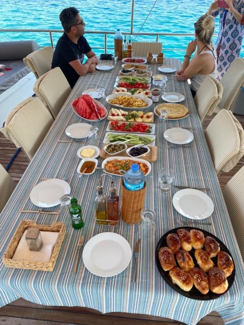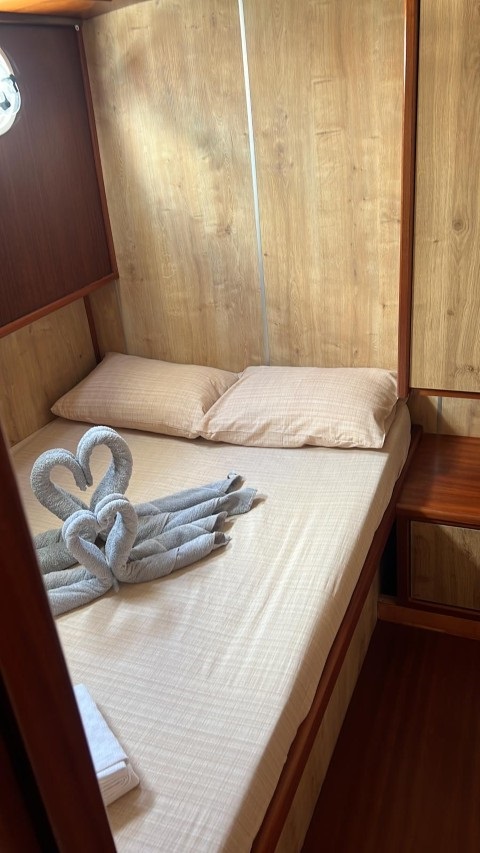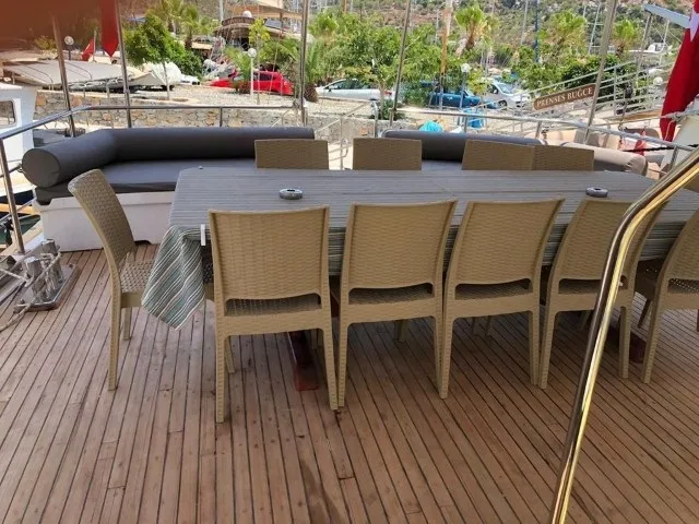 Geniş güverte alanlarında güneşlenme minderleri, oturma grupları ve yemek masaları bulunan teknemiz, denizin ve doğanın tadını çıkarabileceğiniz keyifli alanlar sunmaktadır. Misafir memnuniyetini ilke edinen 4 kişilik deneyimli mürettebatı; kaptan, aşçı ve iki gemiciden oluşmaktadır. Ekip, tatiliniz boyunca size profesyonel ve güler yüzlü hizmet sunmaktadır.