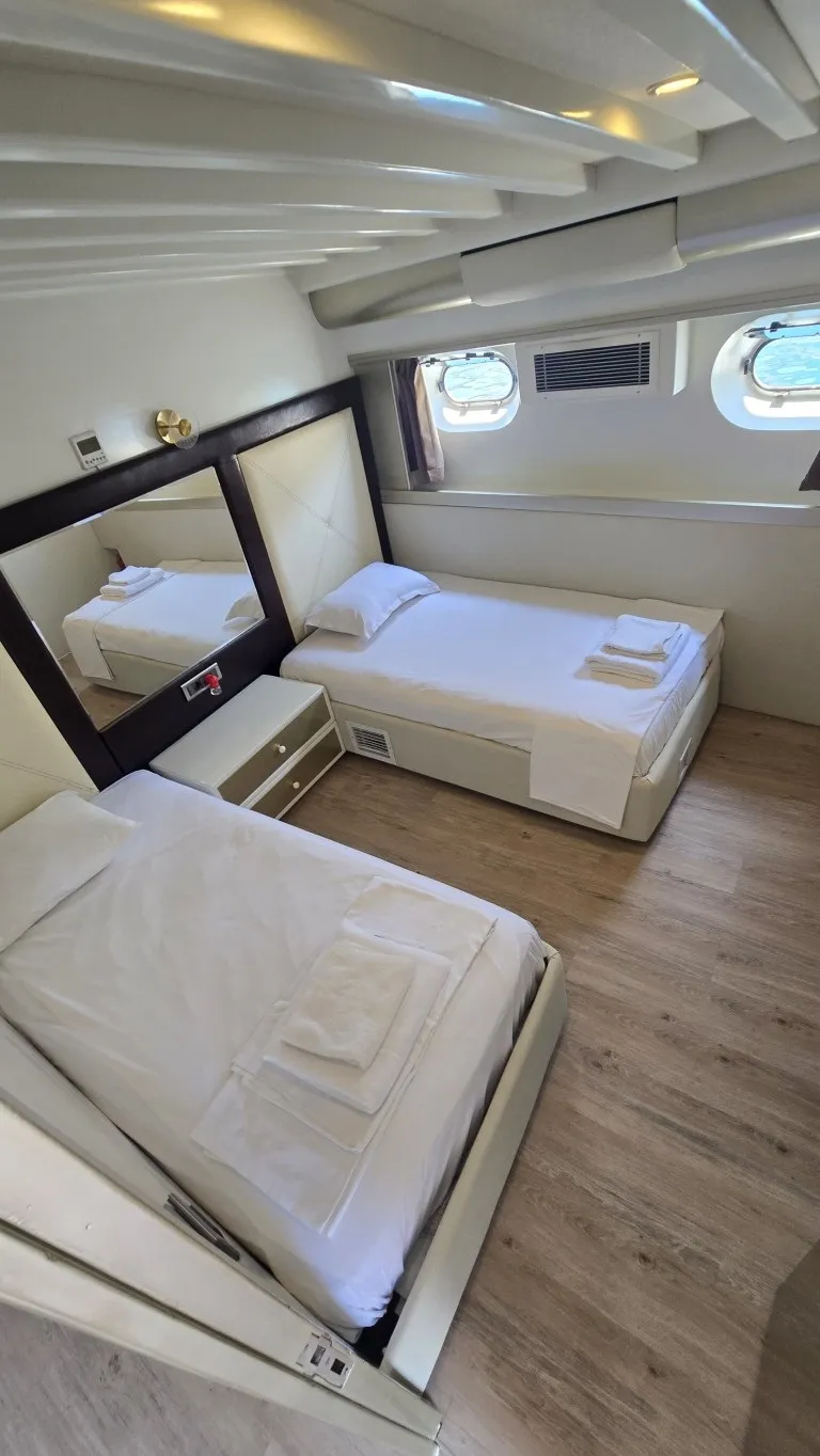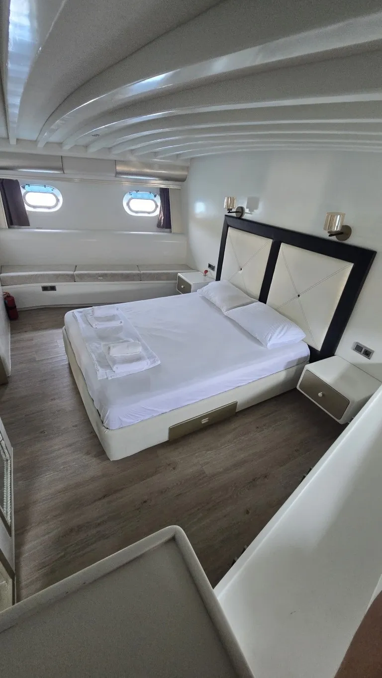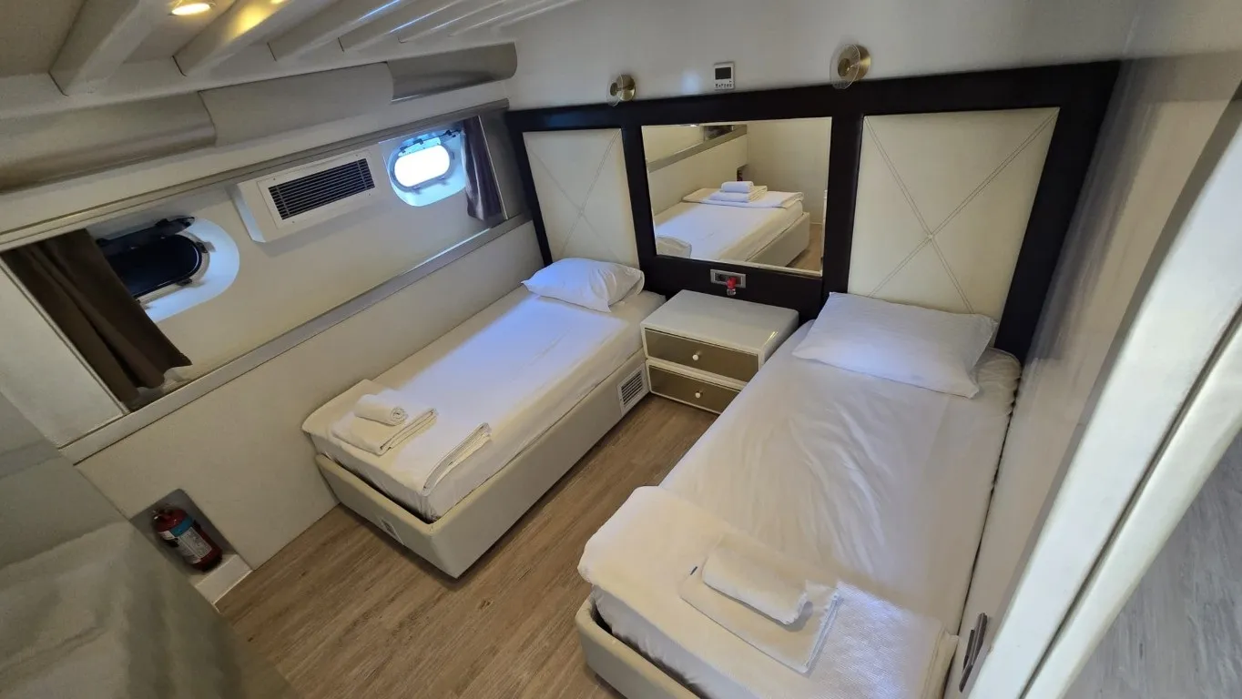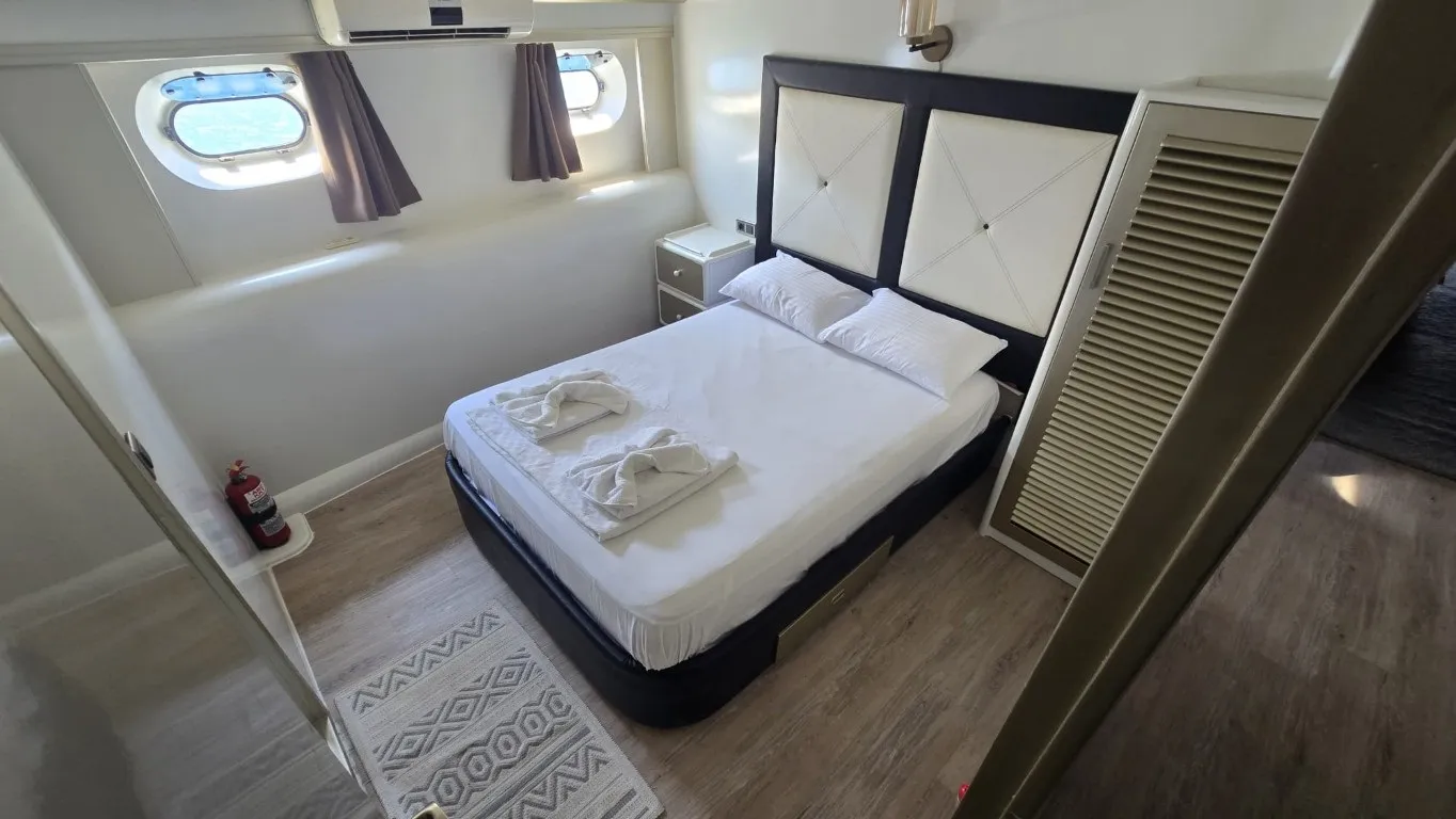 Teknemizde toplamda 7 kabin bulunmaktadır. 1 master, 4 double ve 2 twin kabinleriyle toplam 14 misafiri ağırlama kapasitesine sahiptir. Her kabin geniş ve modern bir tasarıma sahip olup, özel banyo ve wc ile donatılmıştır. 24 saat kullanılabilen klima ve televizyon gibi olanaklarla misafirlerine maksimum konfor sunmaktadır. Estetik ve konforun buluştuğu teknemizde, arka ve üst güvertede şık oturma grupları, geniş güneşlenme alanları ve yemek bölümleri yer almaktadır. Arka kısmında bulunan platform, denize rahatça giriş, çıkış yapmanızı sağlarken, lüks tekne kiralama deneyiminizi daha keyifli hale getirmektedir. Platformlu yapıda bir tekne ile yat turu gerçekleştirmek isteyen misafilerimiz bu detayı dikkate almalarını öneririz.