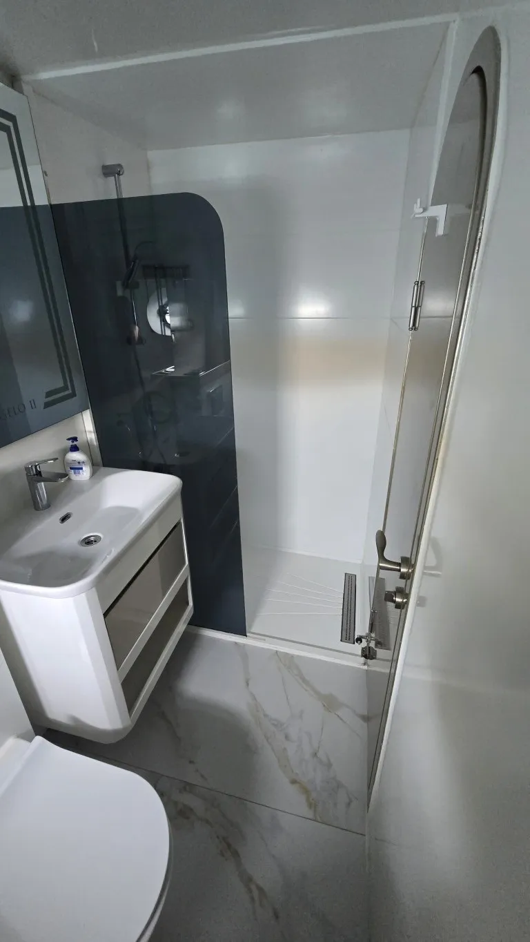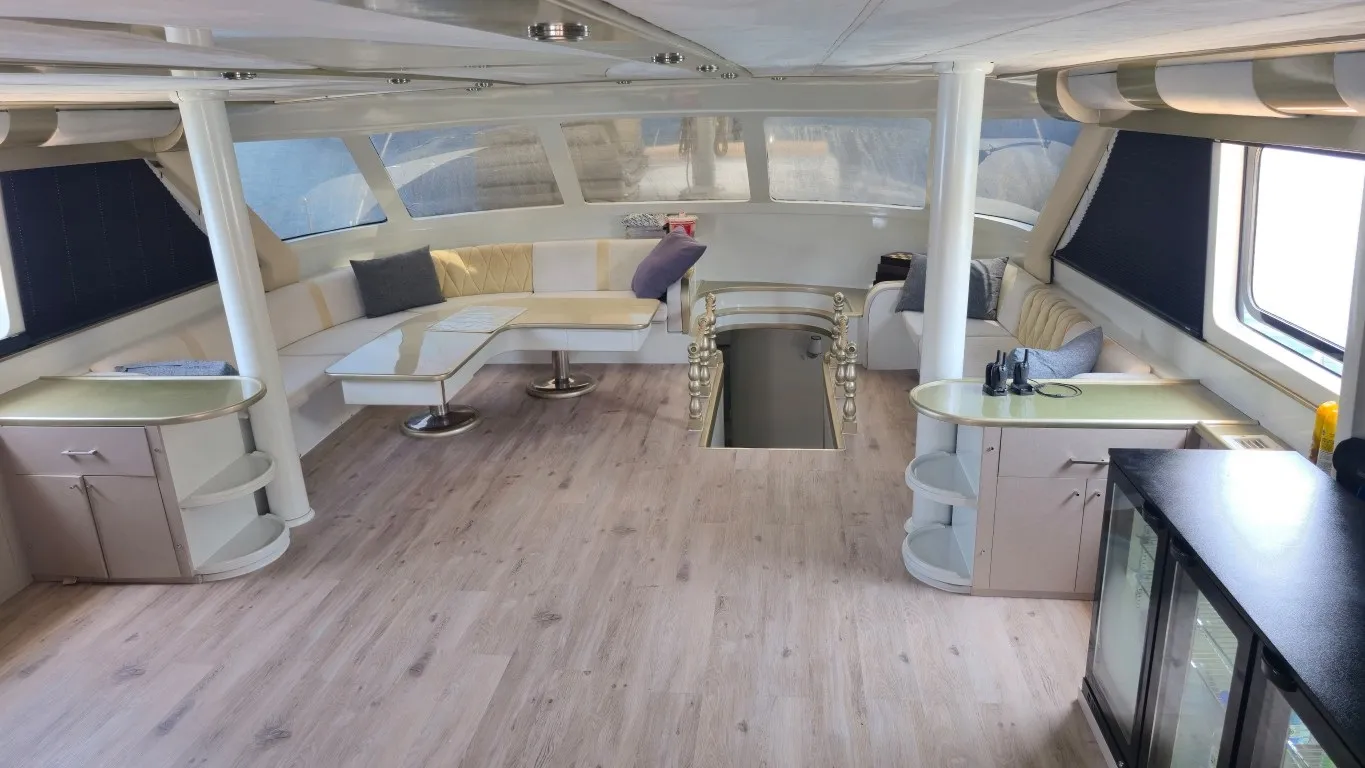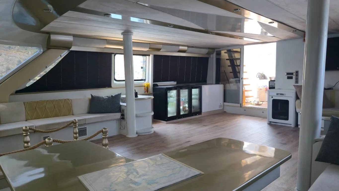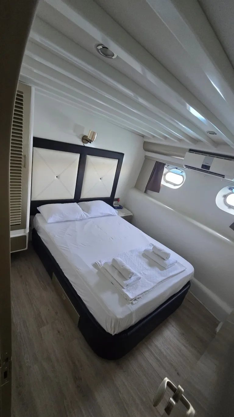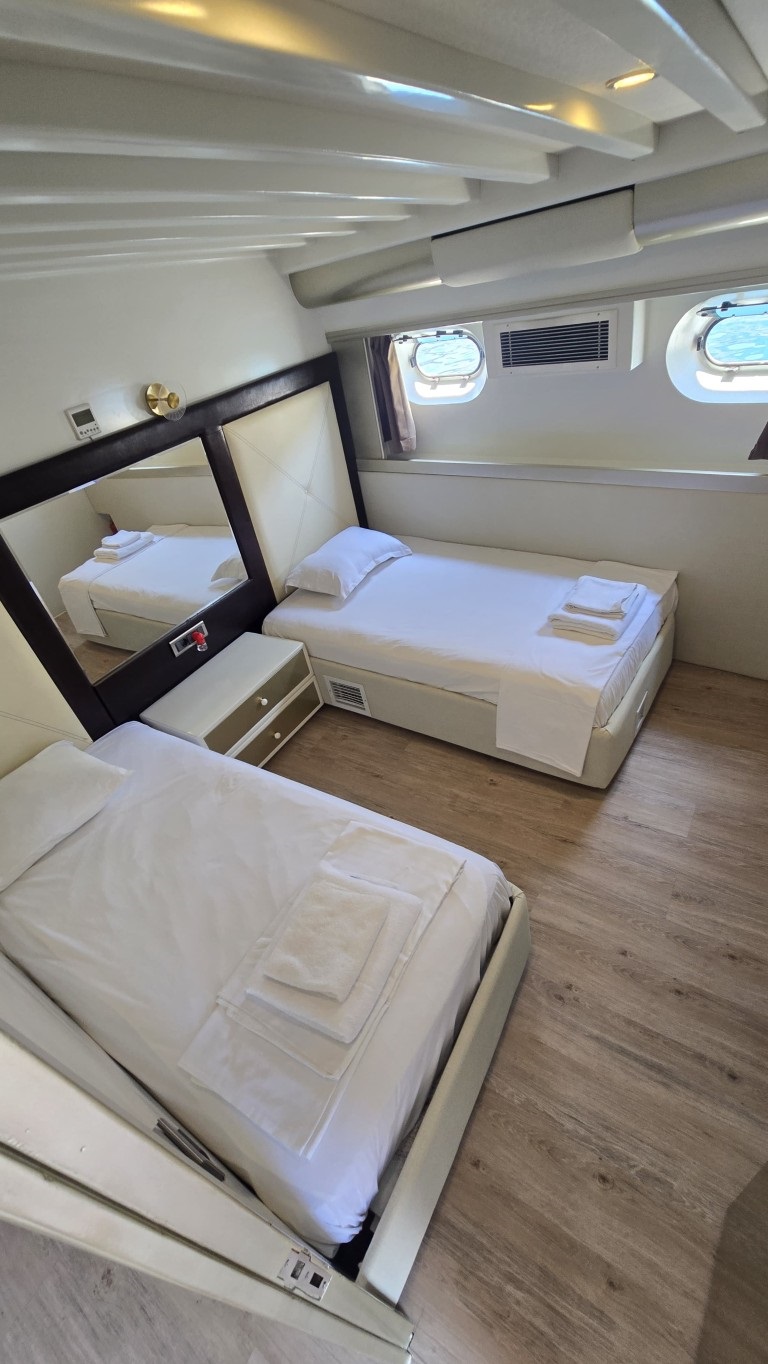 Teknemizde toplamda 7 kabin bulunmaktadır. 1 master, 4 double ve 2 twin kabinleriyle toplam 14 misafiri ağırlama kapasitesine sahiptir. Her kabin geniş ve modern bir tasarıma sahip olup, özel banyo ve wc ile donatılmıştır. 24 saat kullanılabilen klima ve televizyon gibi olanaklarla misafirlerine maksimum konfor sunmaktadır. Estetik ve konforun buluştuğu teknemizde, arka ve üst güvertede şık oturma grupları, geniş güneşlenme alanları ve yemek bölümleri yer almaktadır. Arka kısmında bulunan platform, denize rahatça giriş, çıkış yapmanızı sağlarken, lüks tekne kiralama deneyiminizi daha keyifli hale getirmektedir. Platformlu yapıda bir tekne ile yat turu gerçekleştirmek isteyen misafilerimiz bu detayı dikkate almalarını öneririz.