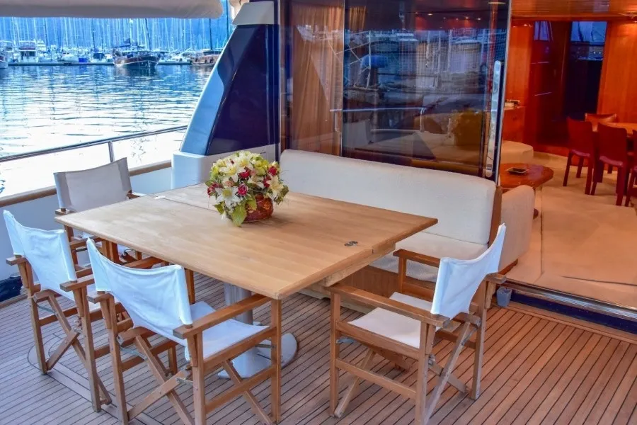 Barbarossa Moratti Motoryat, Göcek’in eşsiz koylarını keşfetmek isteyenler için şık ve konforlu bir seçenektir. Modern çizgileriyle öne çıkan bu lüks motoryat, misafirlerine denizde unutulmaz bir tatil deneyimi yaşatmak için tasarlanmıştır. Göcek mavi tur rotasında ideal bir tercihtir ve 1 master, 1 VIP ve 2 twin kabin olmak üzere toplam 8 kişilik grupları rahatlıkla ağırlayabilir. Yenilenmiş güvertesi, banyoları, iç ve dış mefruşatı sayesinde modern ve ferah bir atmosfere sahiptir. Profesyonel mürettebatı ile güvenli, keyifli ve konforlu bir seyir imkânı sunar. 10 knot seyir hızı ve 22 knot maksimum hızıyla yolculuk hem hızlı hem de rahattır. Günlük kullanımda 4–6 saat klima imkânı sayesinde sıcak yaz günlerinde serin ve konforlu bir deneyim yaşayabilirsiniz. Lüks detayları, konforlu yaşam alanları ve modern tasarımıyla Barbarossa Moratti Motoryat, Göcek koylarında özel bir tatil geçirmek isteyenler için mükemmel bir tercihtir.