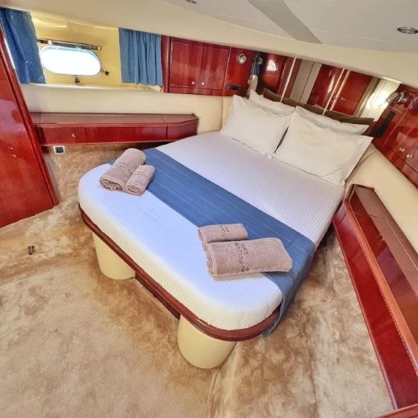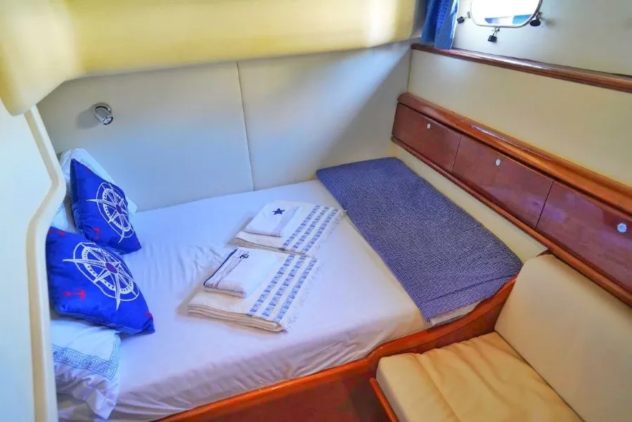 Toplam 3 kabin bulunan teknemizde, 1 master, 1 double ve 1 twin kabin ile 6 kişilik misafir gruplarına konforlu bir tatil alanı sunulmaktadır. Master kabinde özel duş ve tuvalet yer alırken, double ve twin kabinler ortak duş ve tuvalet kullanımıyla hizmet vermektedir. Deneyimli 3 kişilik mürettebatımız, tatiliniz süresince sizlere keyifli ve sorunsuz bir deneyim yaşatmak için hizmetinizde olacaktır.