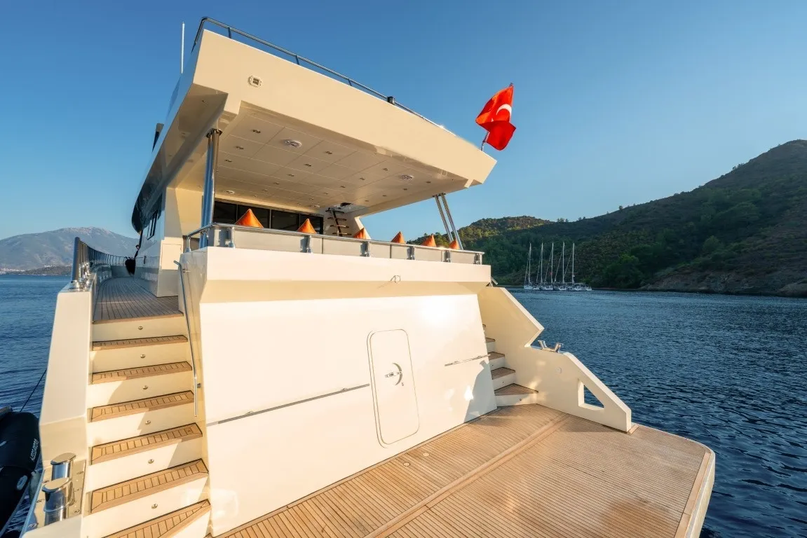 Alessandro Trawler, Göcek Limanı çıkışlı trawler kiralama hizmeti sunan lüks teknemiz, misafirlerine konforla birleşen eşsiz bir mavi yolculuk deneyimi vaat etmektedir. 2025 yılında hizmet vermeye başlayan 26 metre uzunluğundaki teknemiz, 7 metre genişliği ve modern tasarımıyla dikkat çekmektedir.