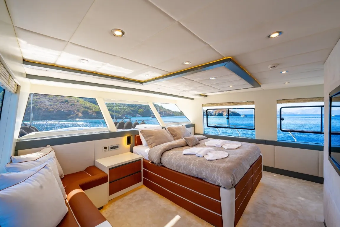 2 master, 1 VIP ve 1 twin kabinden oluşan toplam 4 kabiniyle 8 kişiye kadar misafir ağırlama kapasitesine sahip olan teknemiz, Göcek'in büyüleyici koylarında unutulmaz bir tatil geçirmeniz için özel olarak tasarlanmıştır. Kabinlerde bulunan klima, uydu destekli televizyonlar ve bluetooth bağlantılı müzik sistemi ile konforunuz ön planda tutulmaktadır.