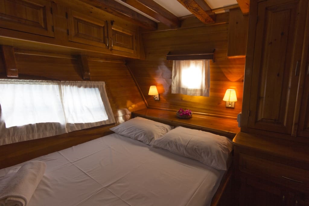 Kabinlerin tamamında özel banyo ve WC bulunmakta olup klima mevcuttur. Kabin yerleşimleri teknenin planına göre yapılmakta, iki ayrı yatak garantisi verilememektedir. Kısa kabin kiralama anlayışıyla sunulan bu yaşam alanları, gün boyu deniz keyfinin ardından rahat bir dinlenme ortamı sağlar.