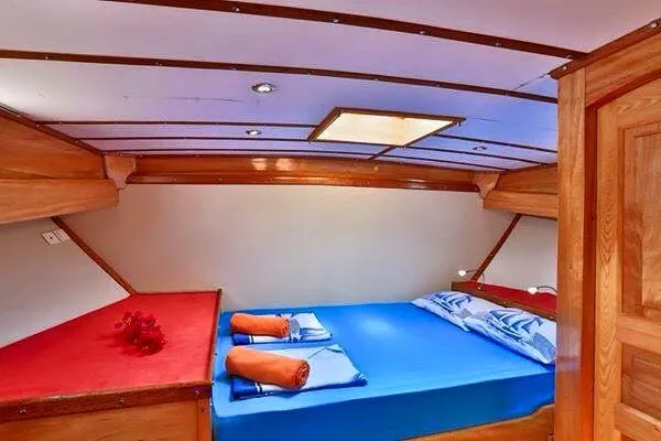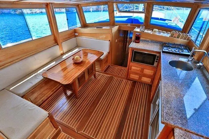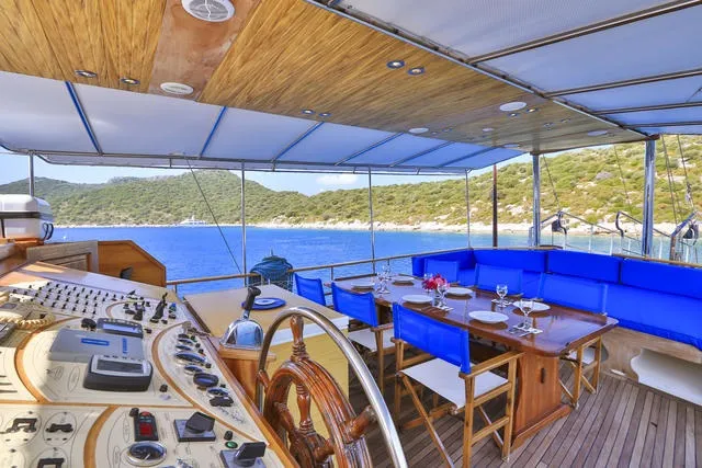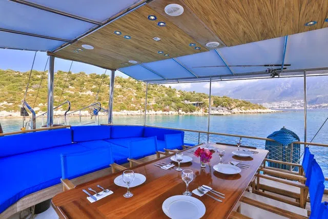 Arka güvertede konforlu yemek alanı ve oturma grubu yer alırken, ön güvertede güneşlenme minderleri ve dinlenme alanları mevcuttur. Guletimizin tasarımı misafirlerin rahatlığı ve keyifli vakit geçirmesi için düzenlenmiştir.