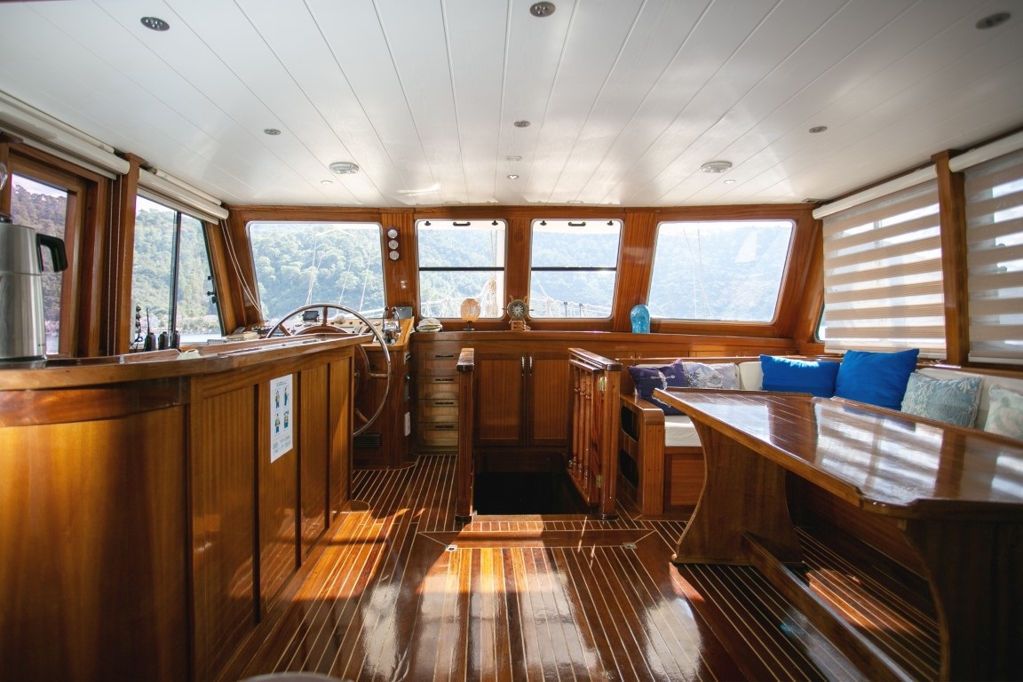 Ön güvertede güneşlenme minderleri, açılır tente ve oturma alanı; arka güvertede ise 8 kişinin rahatça yemek yiyebileceği masa ve geniş oturma grubu bulunmaktadır.