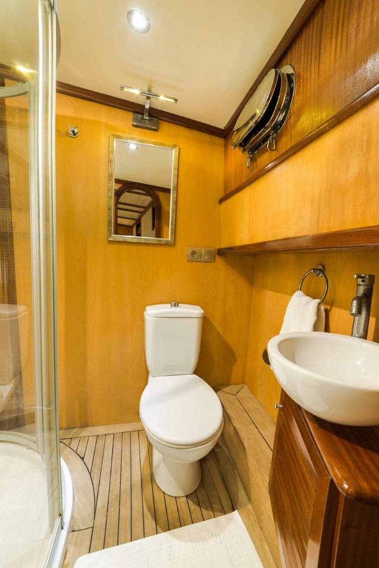 Toplam 3 kabinden oluşan teknemiz, 1 master ve 2 double kabiniyle 6 kişilik gruplara hizmet veren ideal bir 3 kabinli mürettebatlı tekne seçeneğidir. Kabinlerin her biri konforlu ve işlevsel şekilde düzenlenmiş olup, yaz aylarında klima kullanımıyla serin bir konaklama imkânı sunar.