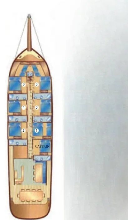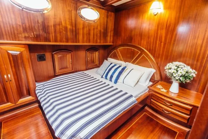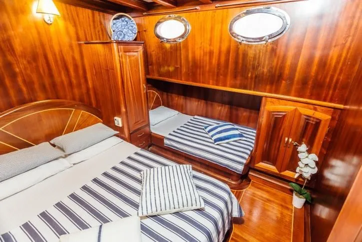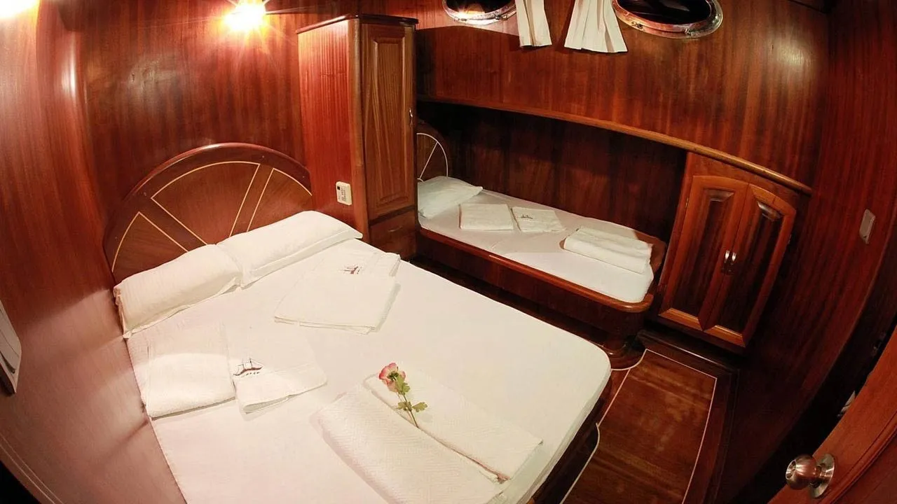 Teknemiz, 5 double ve 1 triple olmak üzere toplam 6 geniş ve ferah kamarasıyla 12 kişilik misafir gruplarına rahat bir konaklama imkanı sağlar. Özenle dekore edilmiş iç mekanı, geniş güvertesi ve konforlu oturma alanları ile misafirlerine otel konforunda bir tatil sunan Galip Nur, mavitur severler için eşsiz bir seçenektir.