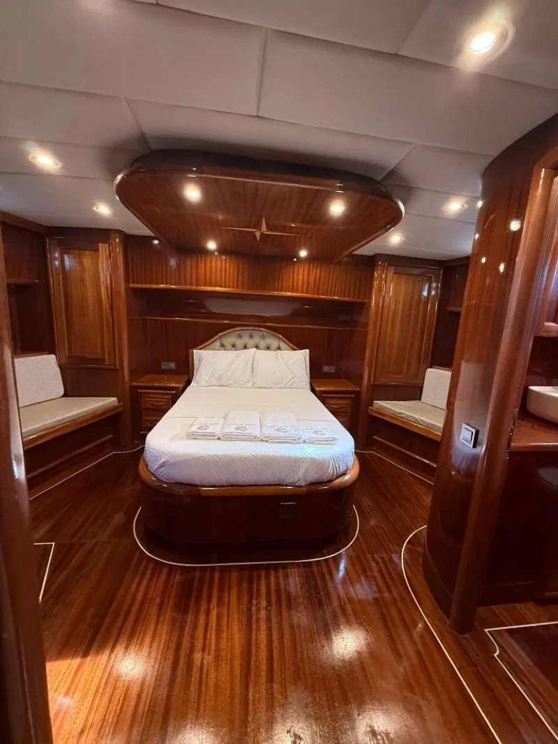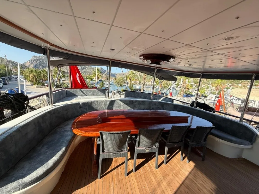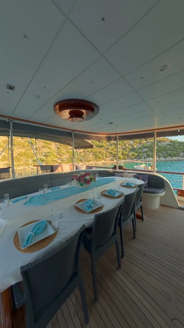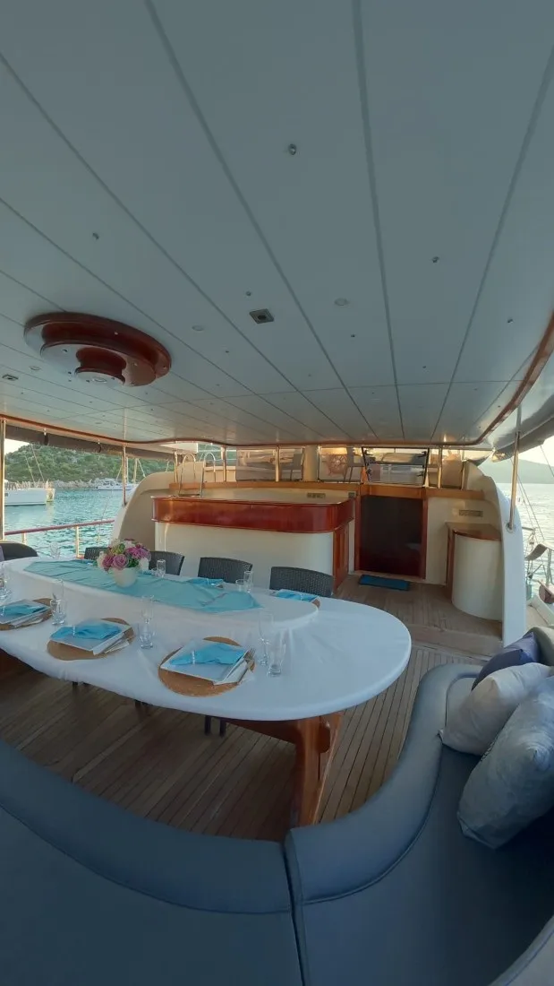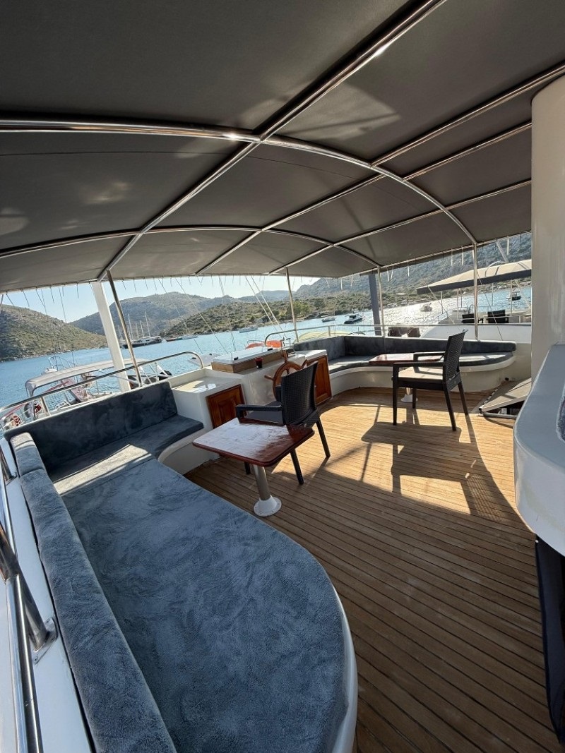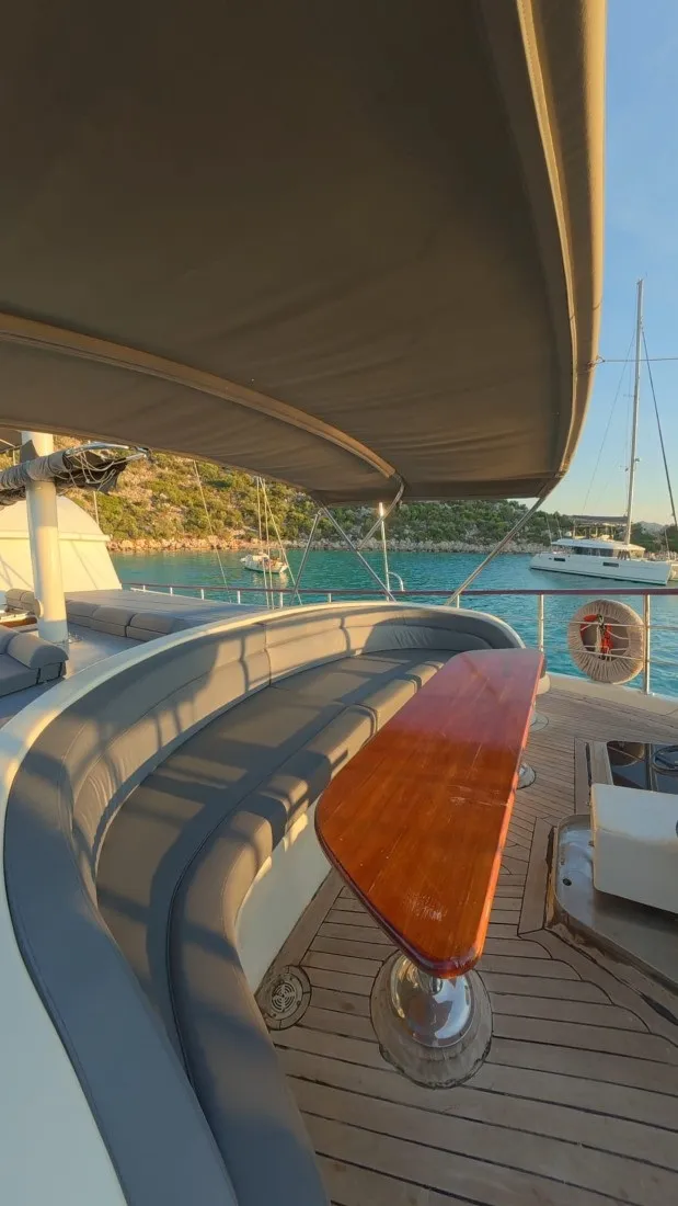 Geniş ön ve arka güvertelerinde güneşlenme minderleri, rahat oturma alanları ve yemek masaları yer alırken, flybridge alanı denize karşı dinlenmek isteyen misafirlerimiz için harika bir ortam oluşturur. Şefimizin hazırladığı özel menüler ise deniz manzarası eşliğinde lezzetli anılar yaratır.