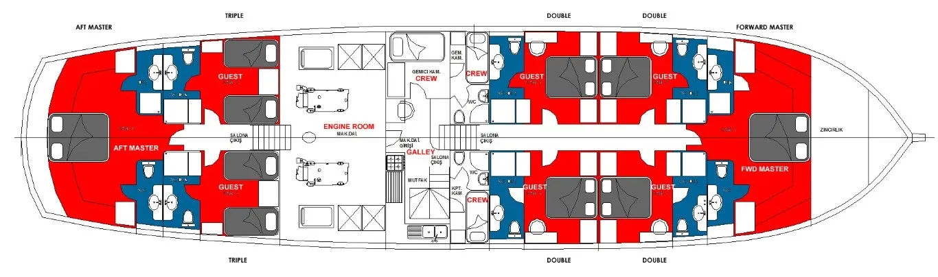 | Kabin Dağılımları | 2 Master, 4 Double, 2 Triple |