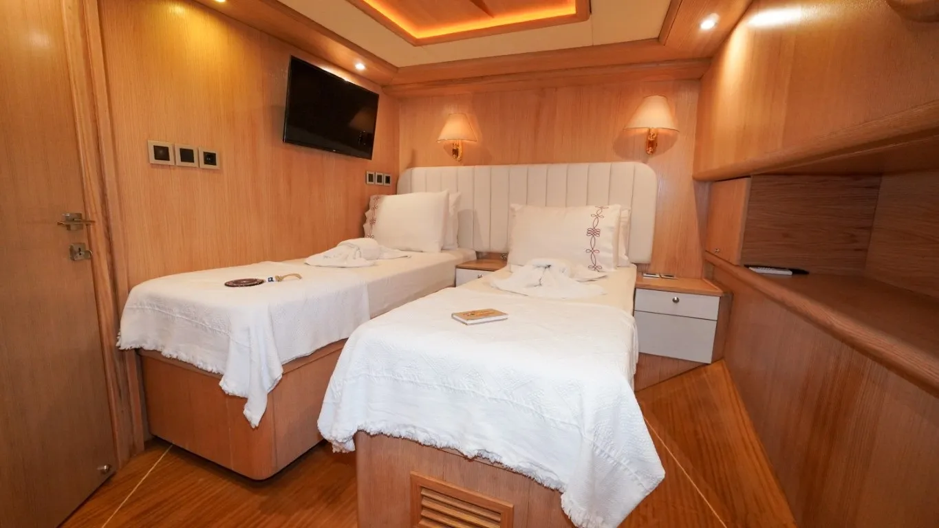 6 double ve 2 twin kabinden oluşan Perla Del Mar, toplam 16 kişilik konaklama kapasitesiyle geniş aileler ve kalabalık gruplar için ideal bir seçenektir. Tüm kabinler konfor odaklı tasarlanmış olup modern duş, wc ve gerekli tüm donanımlarla misafirlerimize rahat bir yaşam alanı sunmaktadır. Gece ve gündüz toplam 8–12 saat arasında klima hizmeti sağlayan teknemiz, sıcak yaz günlerinde dahi konforunuzdan ödün vermeden seyahat etmenize olanak tanır.